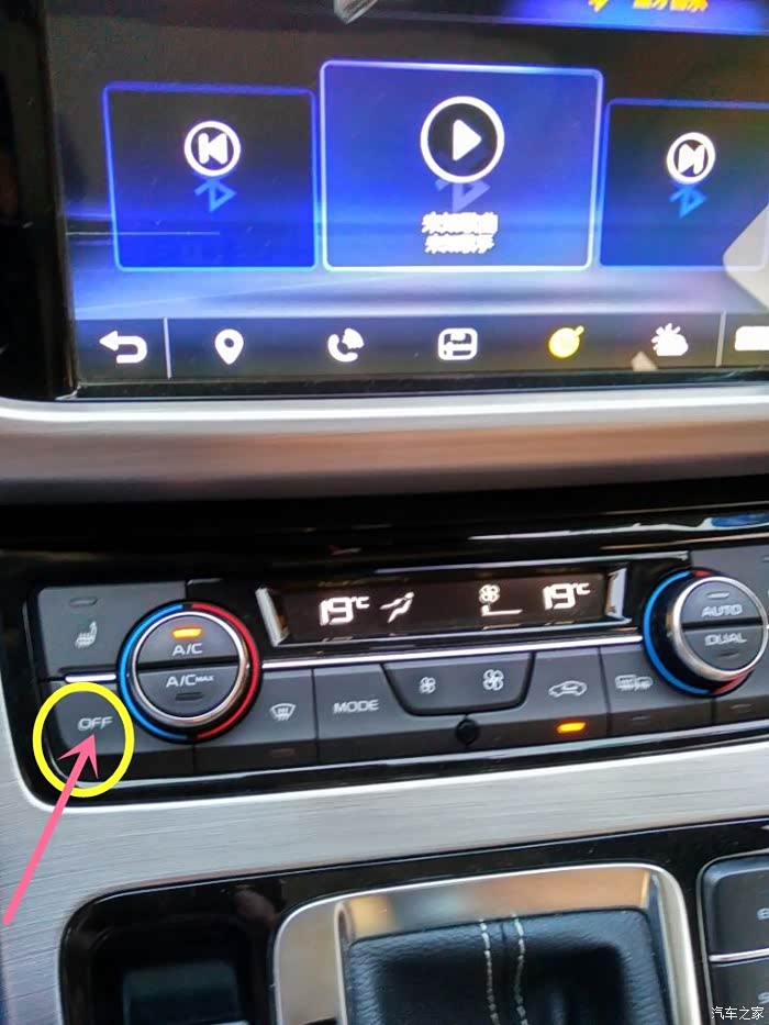 摁下OFF按钮,空调关闭,每次熄火前,最好关闭空调开关!