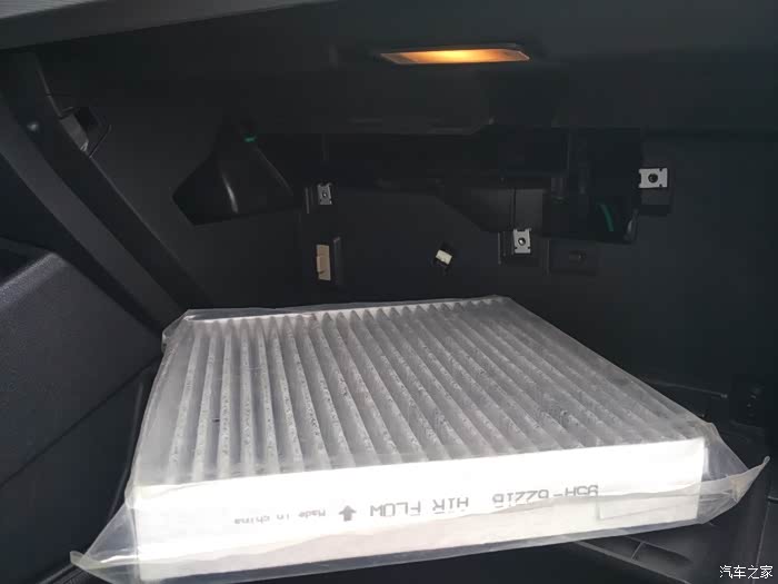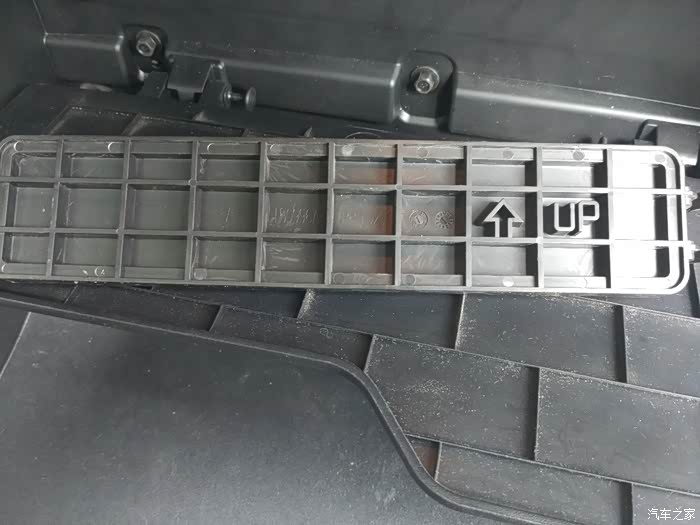 护板下来后就露出空调滤芯的全貌了,看好方向不要记错了,一会更换新的空调滤芯也要用同样方向进入,因为空调滤芯有正反,不要弄错
