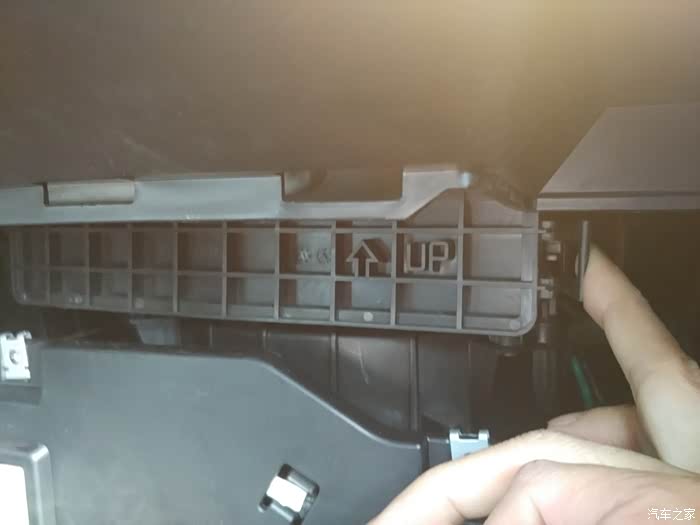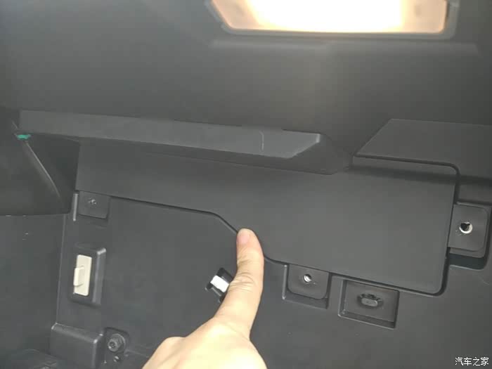 手套箱下来后就会楼主这个板子,手指处就是乐,用十字改锥,把上面的几个螺丝拧下来,板子就会掉下来
