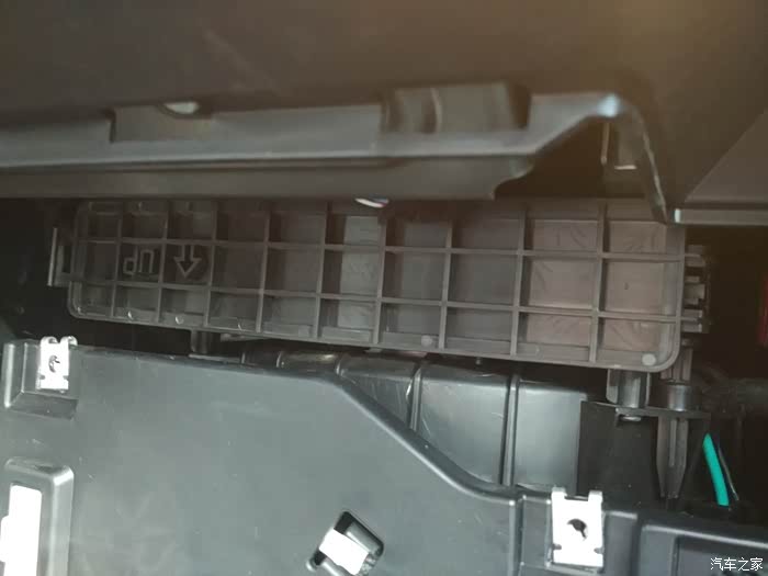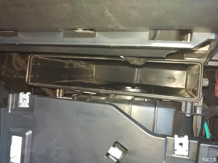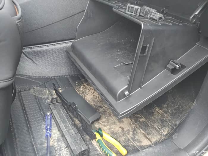 书归正传,咱们先看看如何更换空调滤芯。空调滤芯就在副驾驶的手套箱里,先吧手套箱里的东西清空,用尖嘴钳子把这个东东卸下来,方便简单