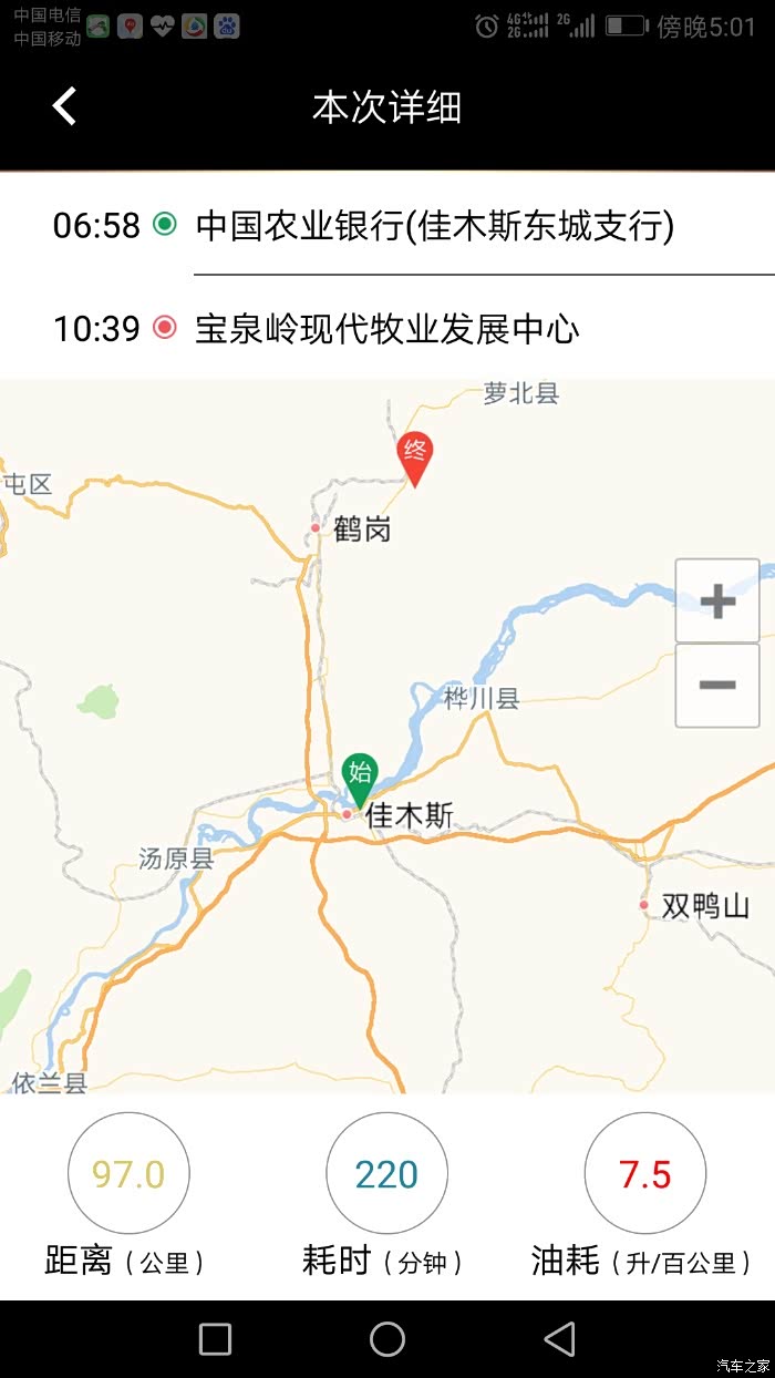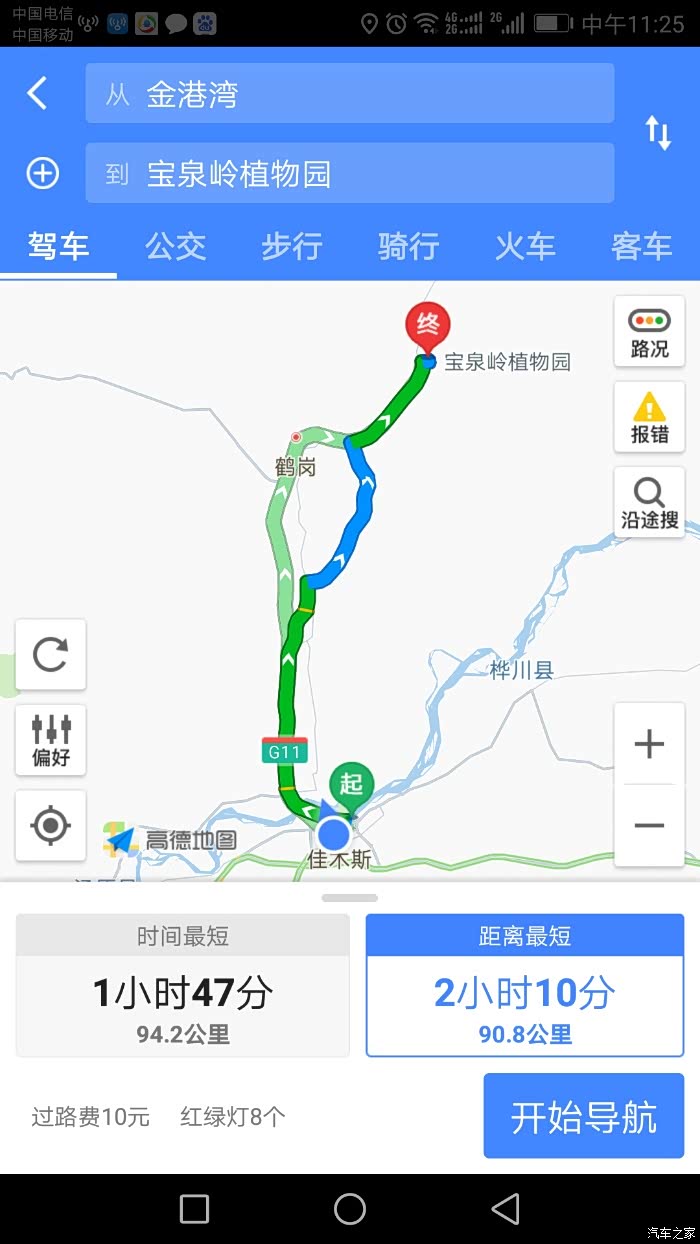 导航有两条线路,一条经过鹤岗市区,大部分都是高速,一条从鹤立下高速走新华电厂,我们选择了后者,回来时走的第一条路线,这样两条线路就都体验了。