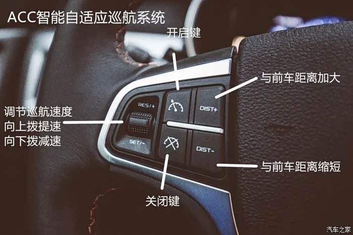方向盘左侧自适应巡航控制区。