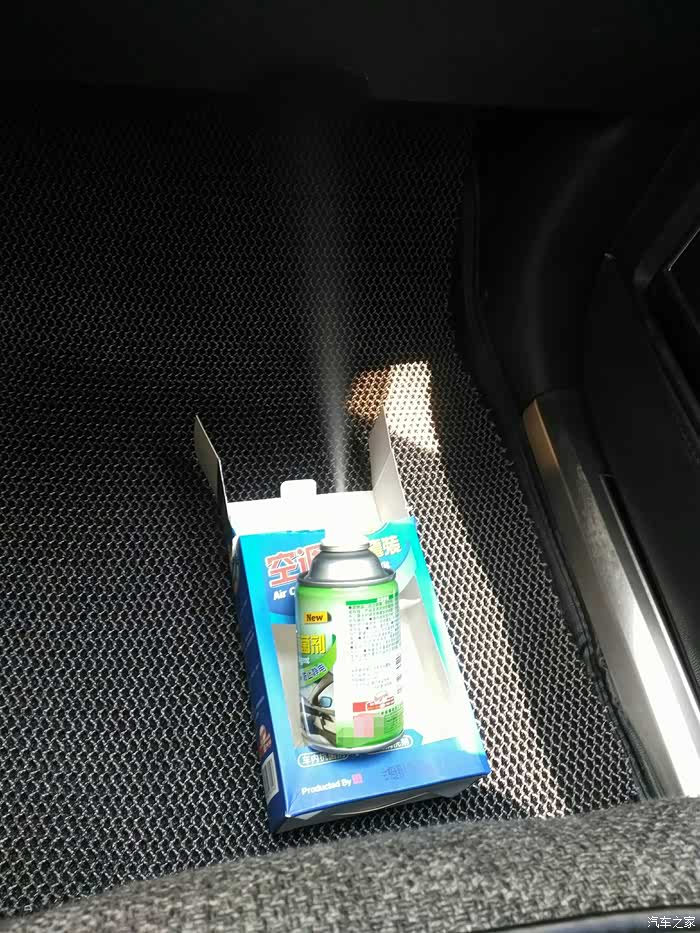 抗菌剂开启,处于喷射状态,放在副驾驶座位下边,对准手套箱下部,人离开关闭车门