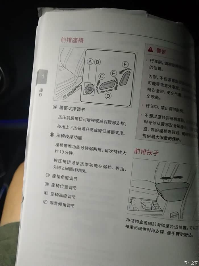 还有人看这个古老的产品说明书工具么。座椅按摩在车上找了半天没弄明白在哪里,系统座椅设置里面只有加热和通风,最后还是看说明书弄明白了,研究了一路开着开着就到家了。