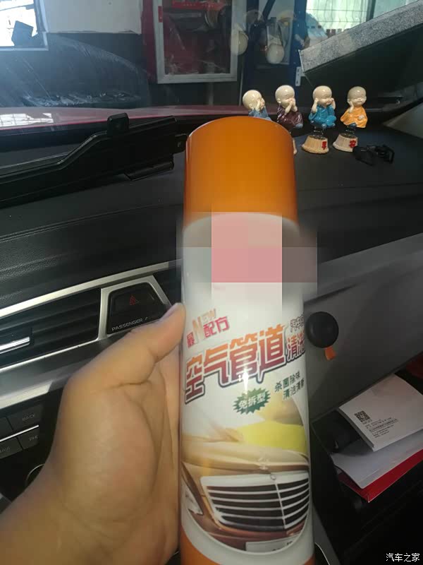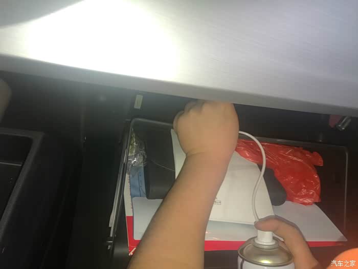 给滤芯这里喷一点,再来给出风口也喷喷。空调开到最大风挡,充分清洗管道。几分钟后开始装上新的空调滤芯