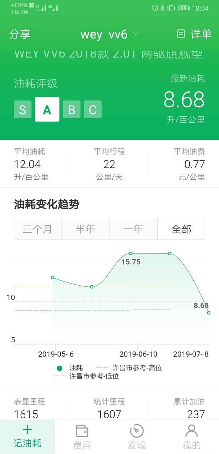 ),总行程1607(高速40、市区60%)公里,平均油耗12.04L/100km。以下是详细作业,有图有数据,与各位车友一起分享。说明:油耗跟每个人的开车习惯、车辆状况以及路况都有很大关系,此次测试仅与我个人的车辆和开车习惯有关,不能代表大家的意见。仅供参考!!