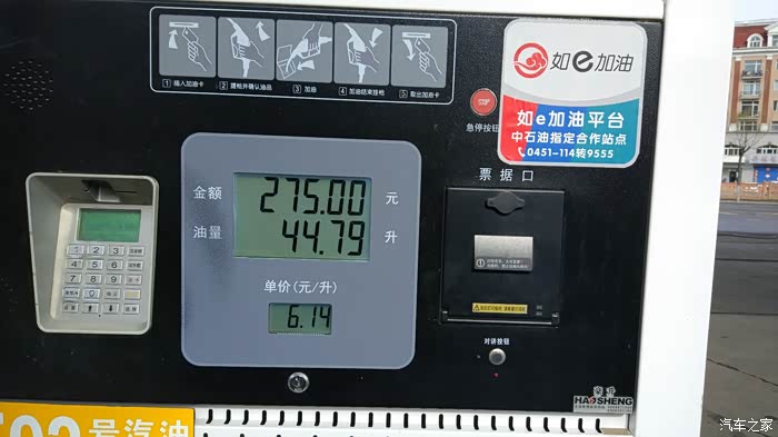我们开始加油!本次测试正好赶上油价下调6.14元每升加了250元44.79升,实际上就是加满。然后我们打火在熄火!