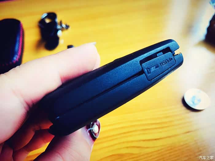 准备拆开车钥匙壳,在车钥匙侧面有个【PUSH】的按键,按住可以取出备用机械钥匙