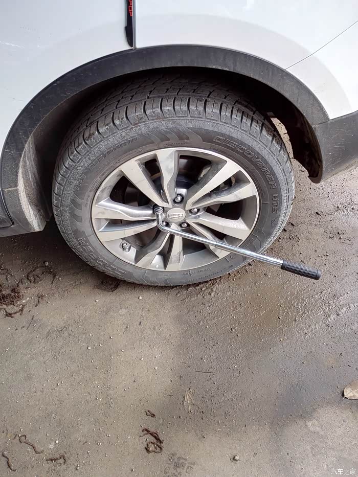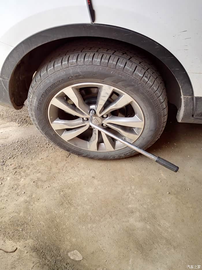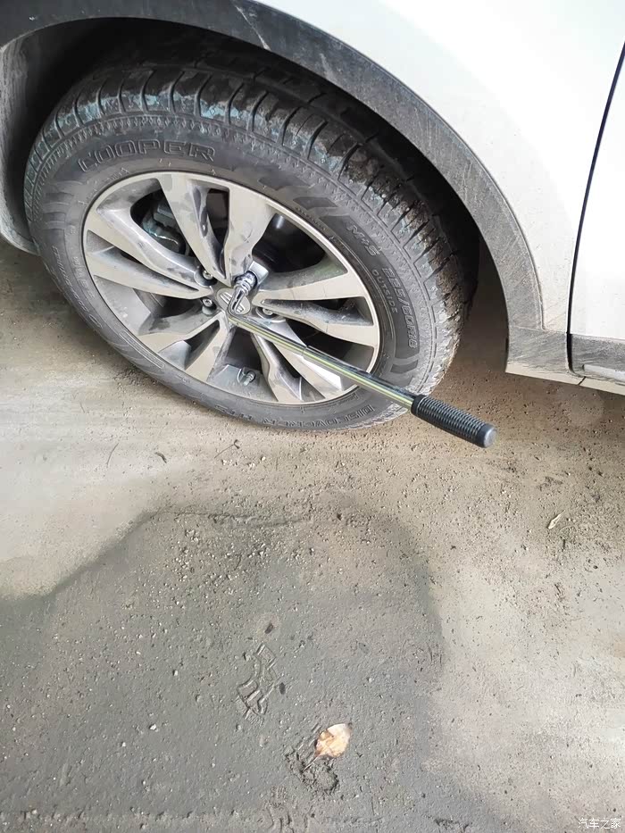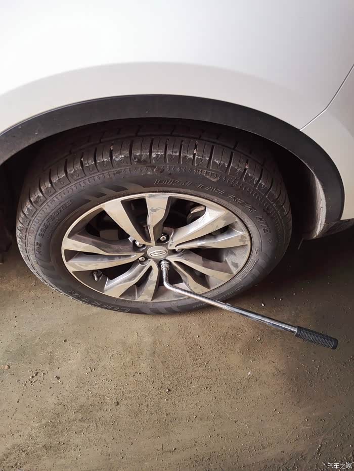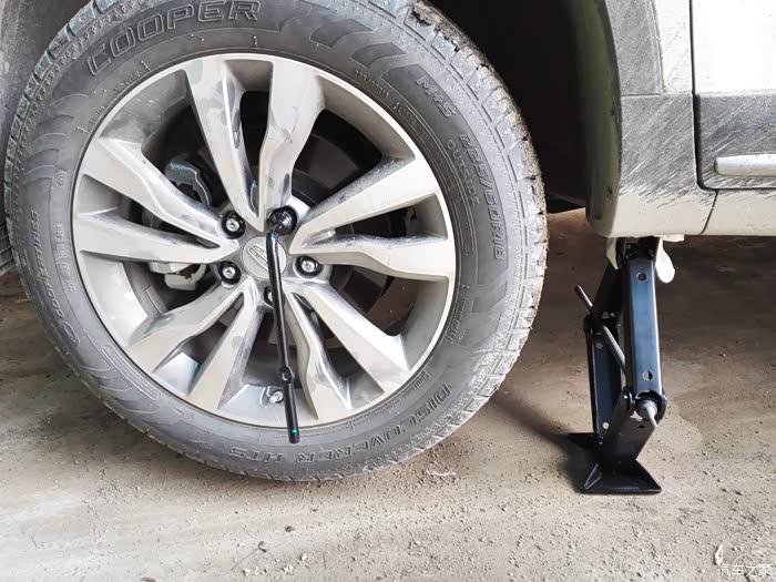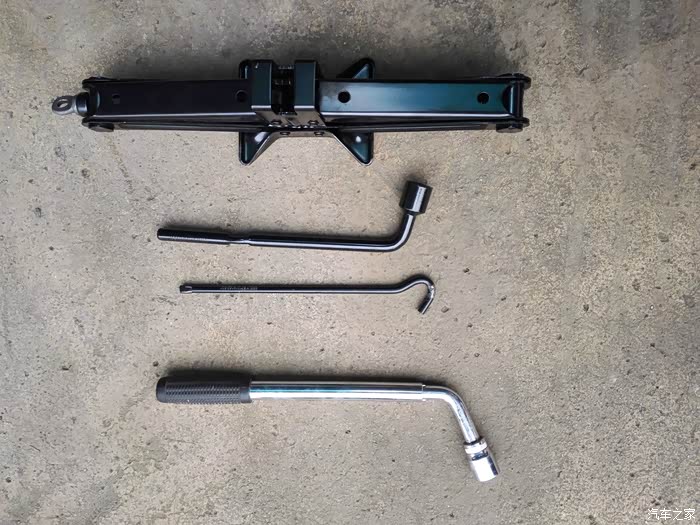 上以工具只有最亮的一个拆轮胎螺丝的是自己买的,其它原车工具,位置在后备箱隔板下面,大家都知道的,只是拆轮胎的工具实在是费劲,自己买了一个来用,好了,说正题,第一步先把全车轮胎的螺丝拆松,只是拆松,因为用上了千斤顶后一是不好用力,二是不安全,所以先松螺丝。