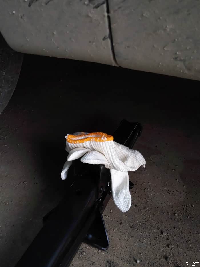 从左前轮开始拆,第二步上千斤顶。用一支手套把开口位置垫一下,目的是为了不伤车漆。