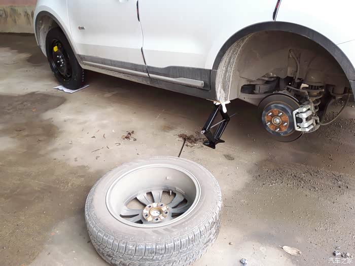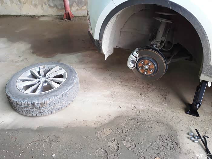 这是拆下来的左后轮,根据说明书换位的方法,左前换到左后,所以用备胎放左前,一会儿拆下来的左前胎放左后这个位置。