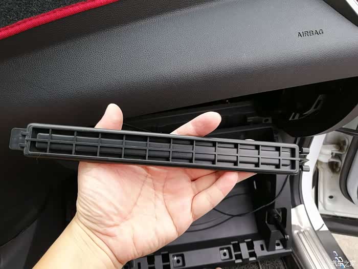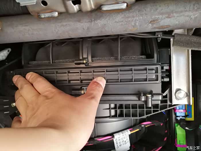 拆掉手套箱,就看到了空调风扇口上的空调滤芯保护罩,两边一起按住就可以拿下来。