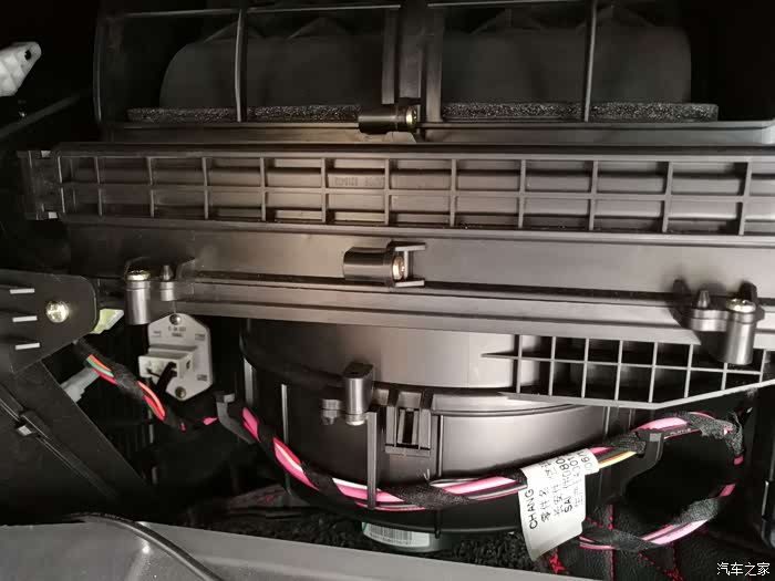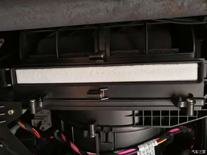 滤清器所在的位置,下面是空调的鼓风机,自己清洗空调的车友们需要注意,不恰当的清洗方式容易烧毁鼓风机,所以还是选择专业的维修店火4S店拆机清洗比较靠谱。