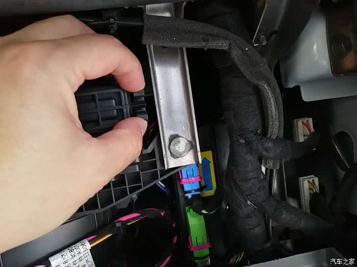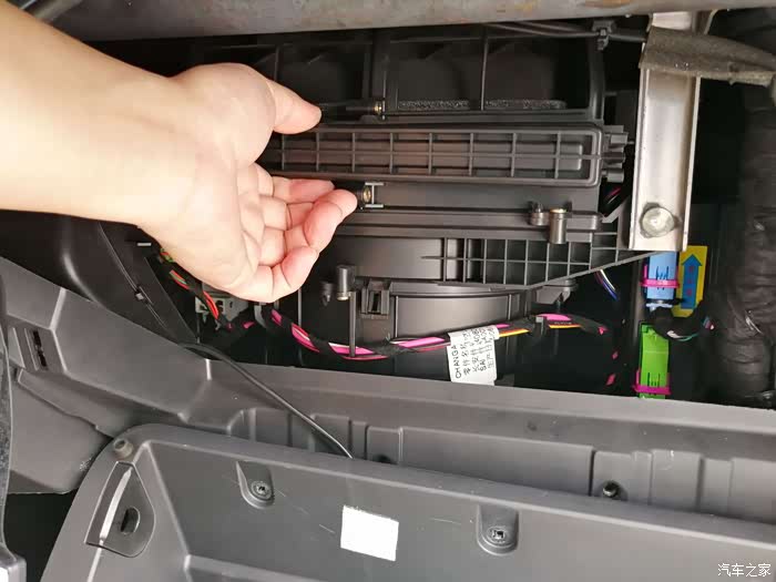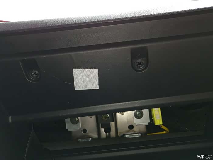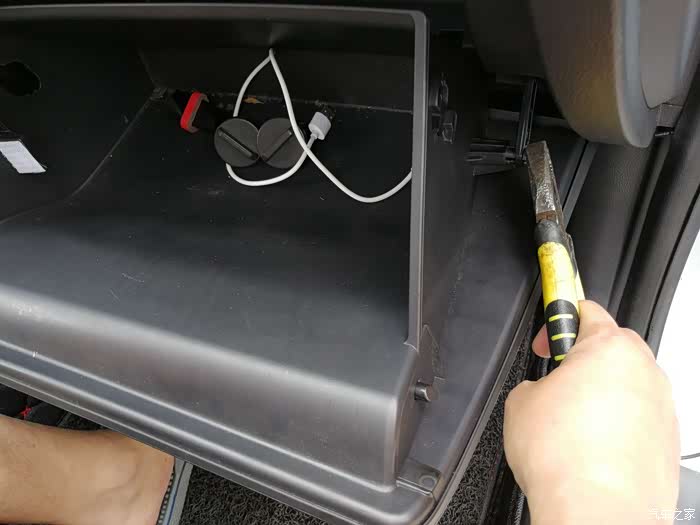 手套箱去掉后,可以看到固定滤清器的额外盖板,下面4颗上面3颗共有7颗螺丝固定。