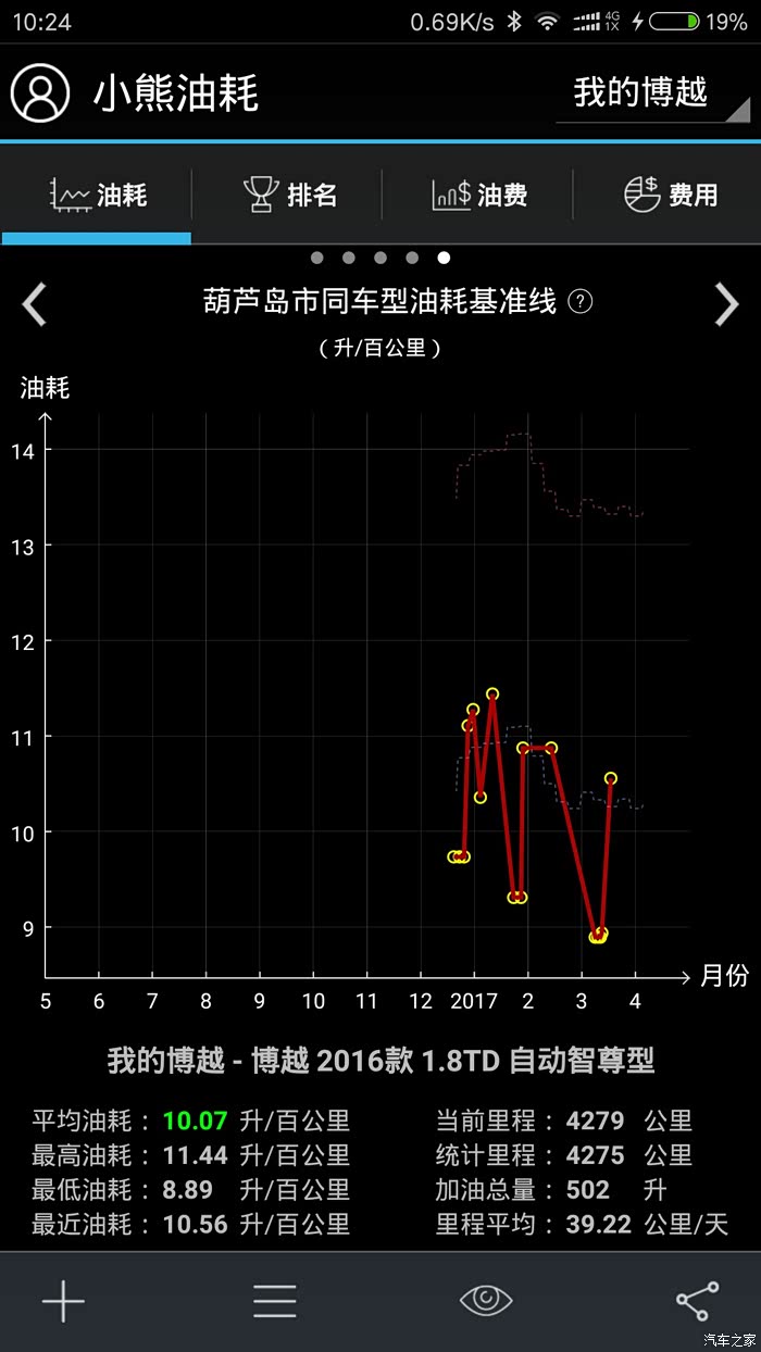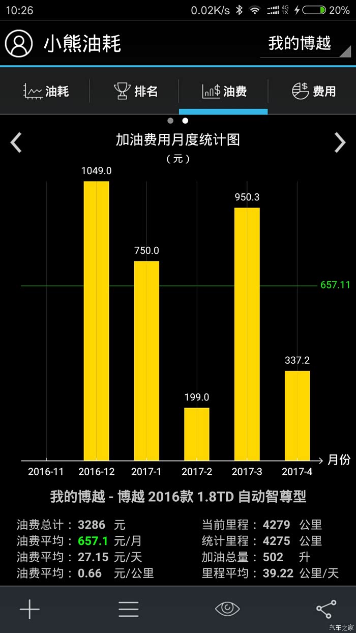 前2000公里加的中石油E92号油,后面一直加的E95号油,基本都是固定在一个加油站加油,除了跑长途没办法之外。根据“小熊油耗”记录,目前记录统计里程4275km,加油总量502升,费用3286元,平均每公里0.65元,平均油耗10.07升/百公里。