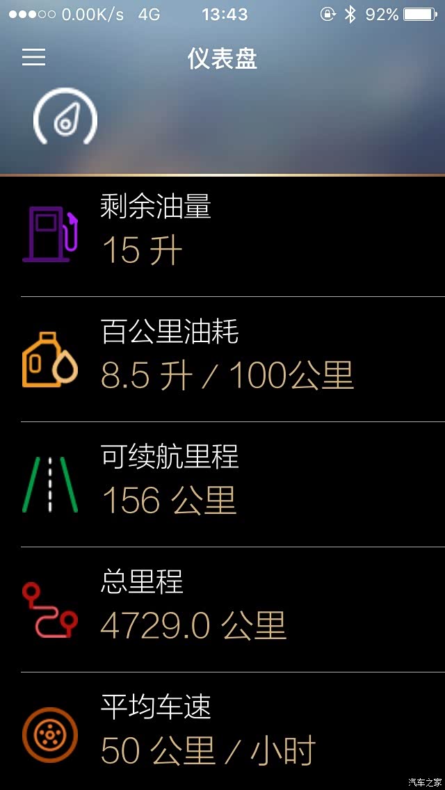 里程表显示:总里程4729km,平均车速50公里/小时,百公里油耗8.5升/100公里。