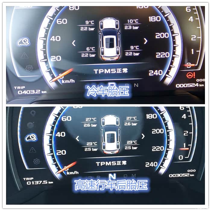 【楼主经验】:我们没有必要盲目的调高胎压,厂家给出的标准胎压就是最合适的(博越满载和空载都是2.2kPa,备胎420kPa,冬天和夏天可以视情微调),胎压过高不但起不到省油的作用,反而影响驾驶舒适性,甚至还会增大爆胎的几率,影响安全。