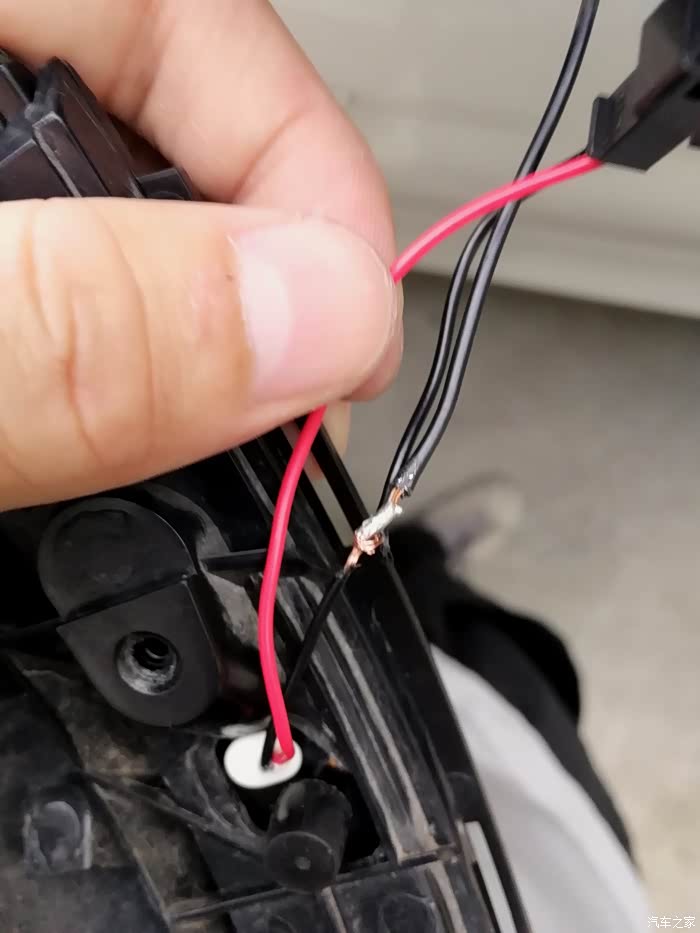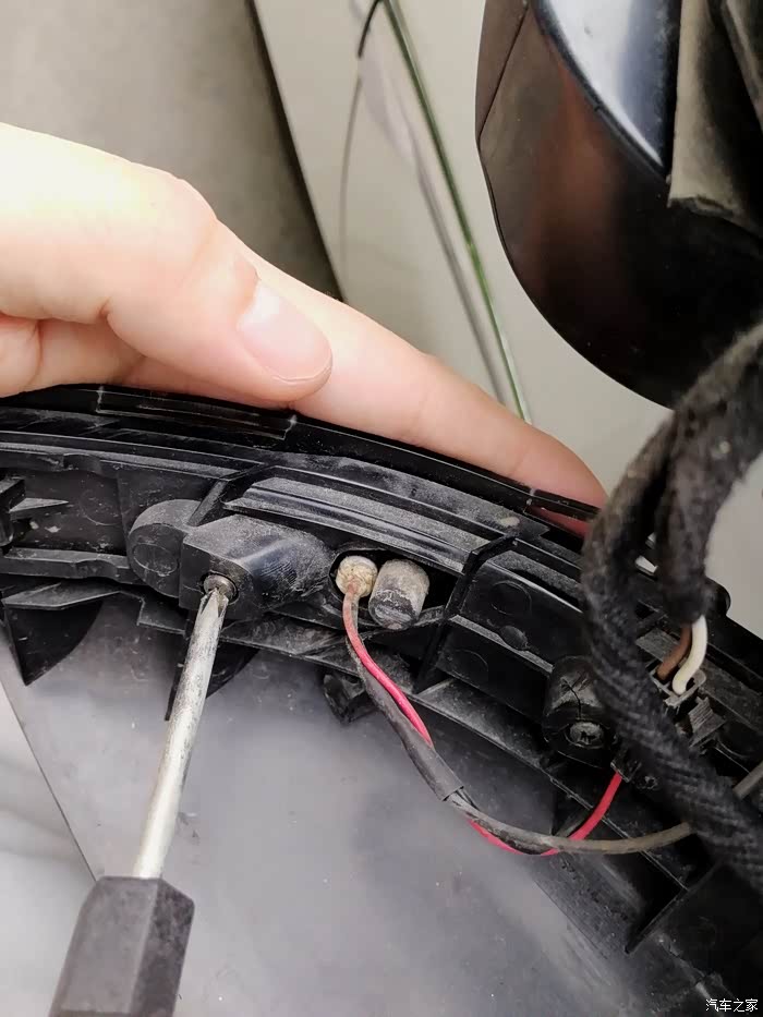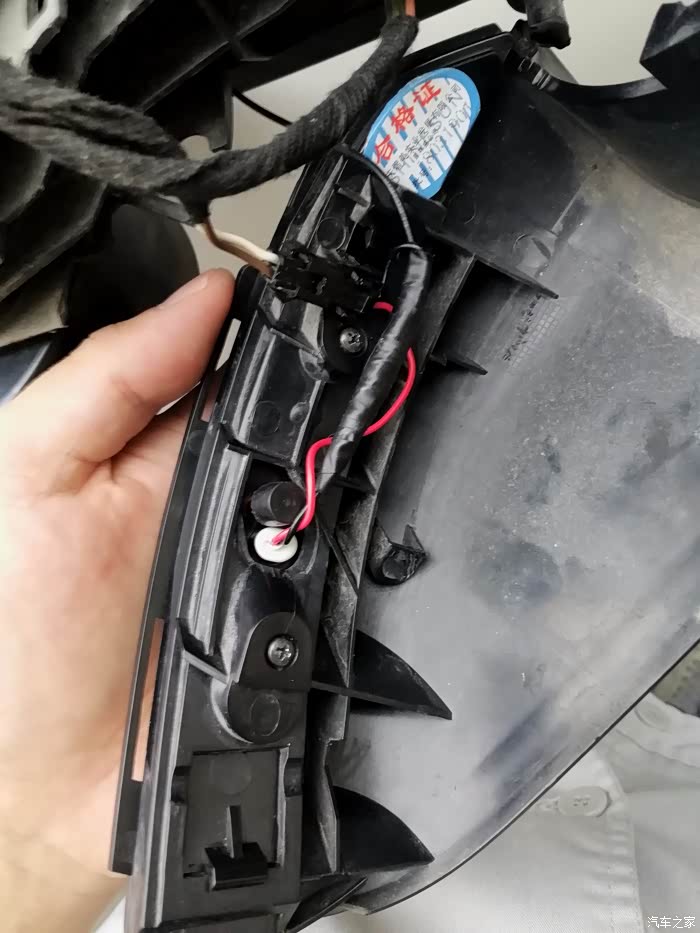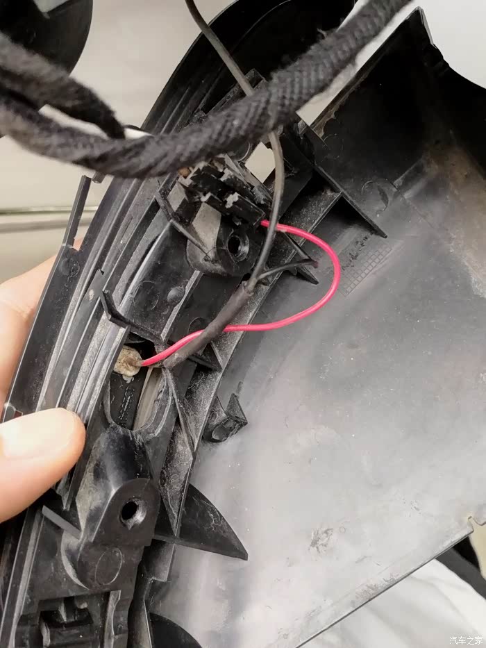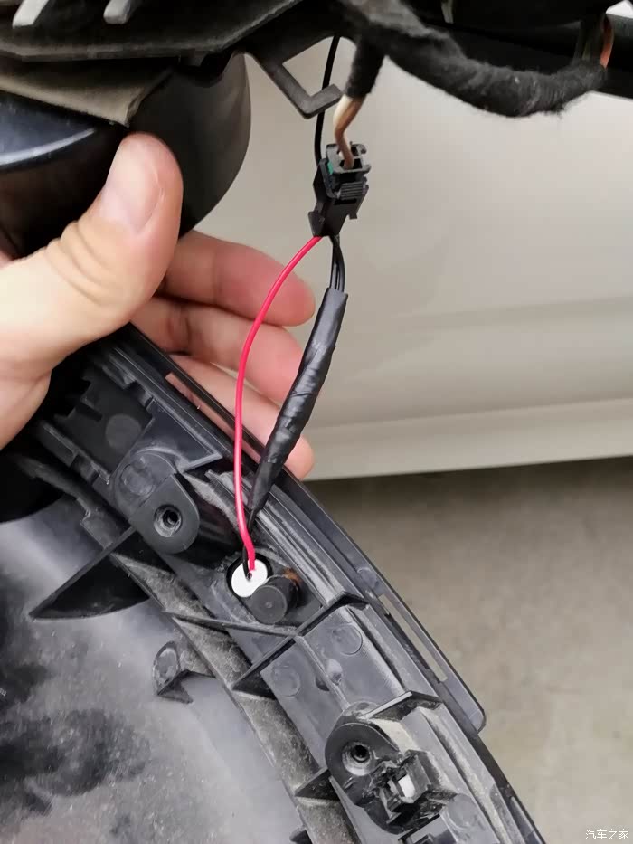 接下来就是这个接线了,转向灯是2根线(一红一黑),实际上原车还有一根黑线是后视镜加热的,是跟转向灯的黑线接在一块儿,所以这里可以直接把原来的转向黑线剪掉。