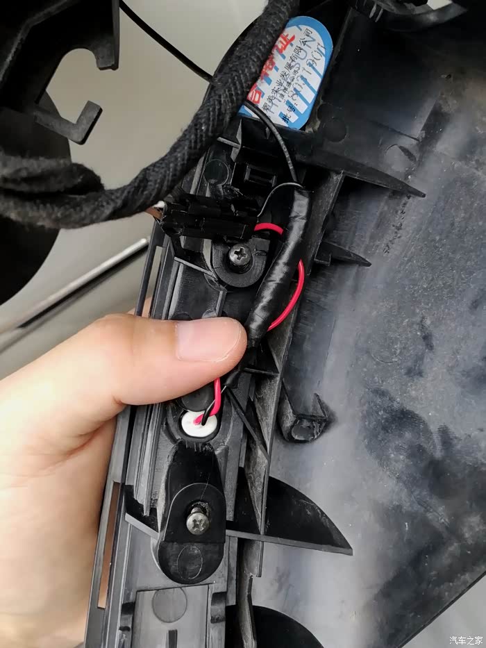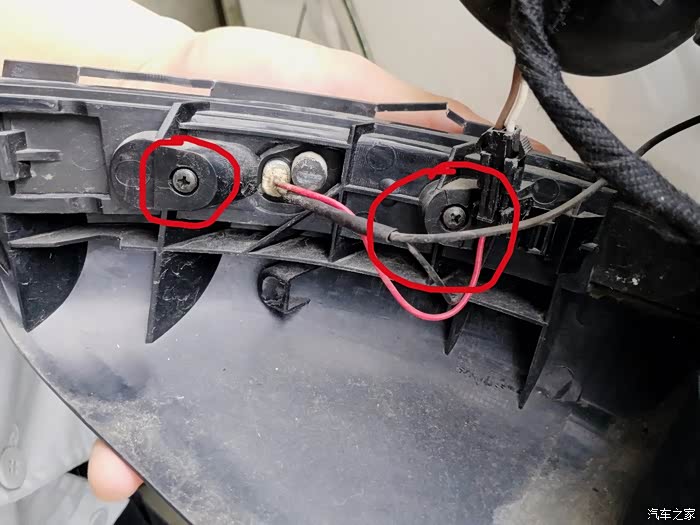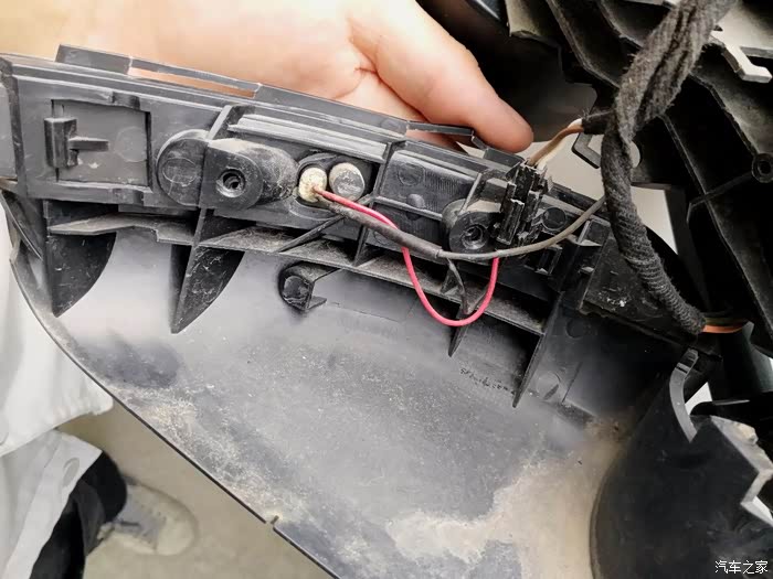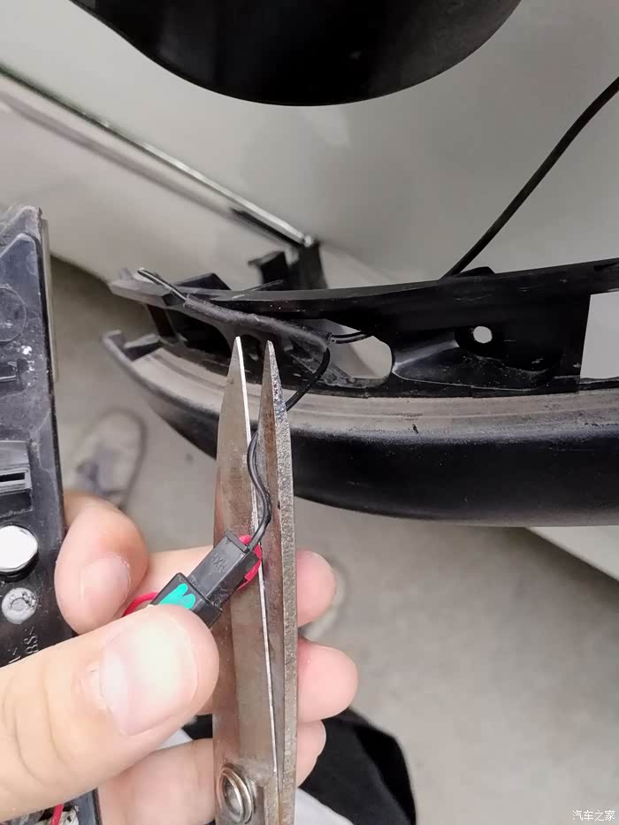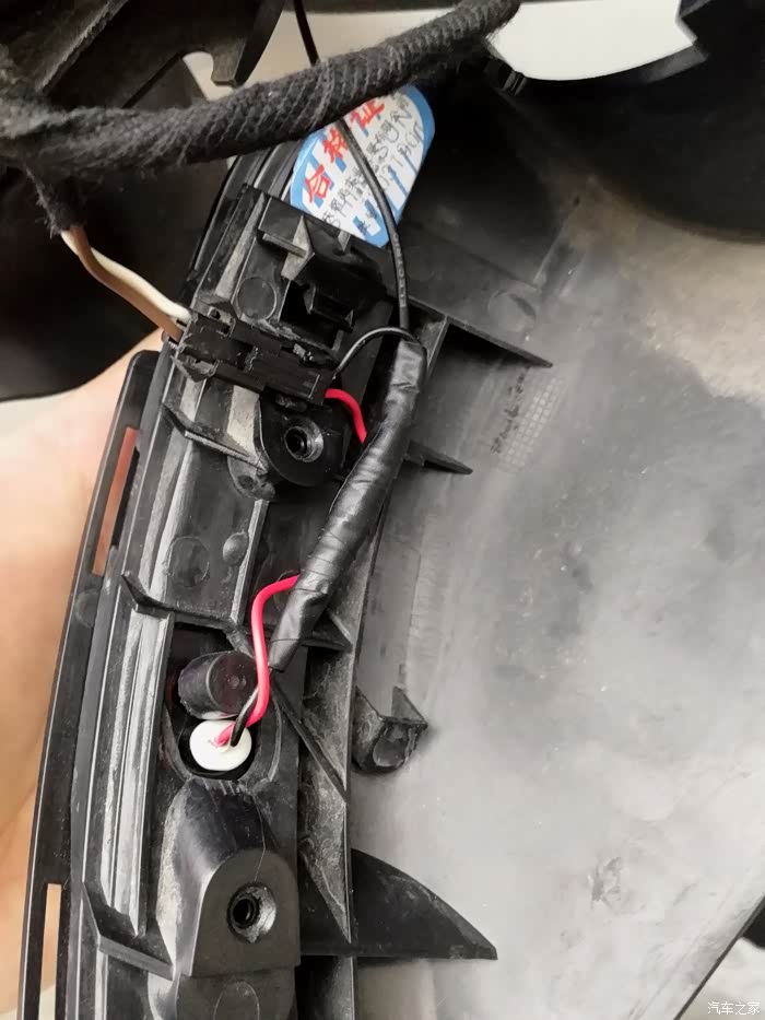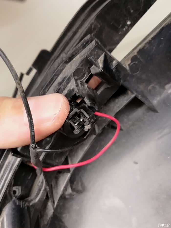 接下来就是这个接线了,转向灯是2根线(一红一黑),实际上原车还有一根黑线是后视镜加热的,是跟转向灯的黑线接在一块儿,所以这里可以直接把原来的转向黑线剪掉。
