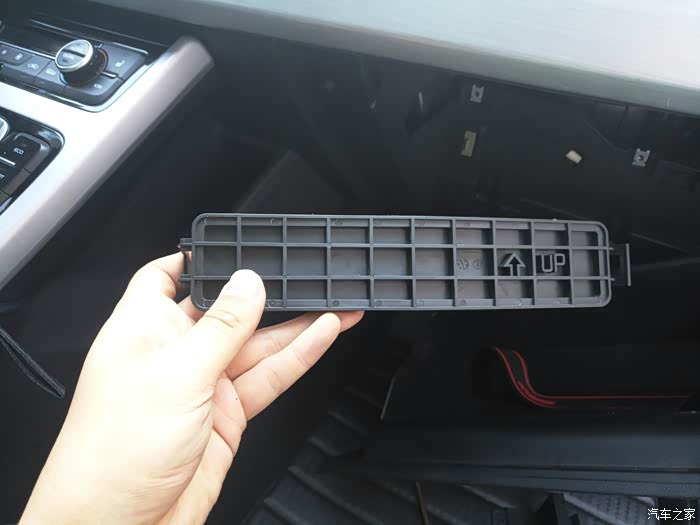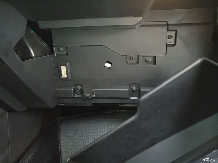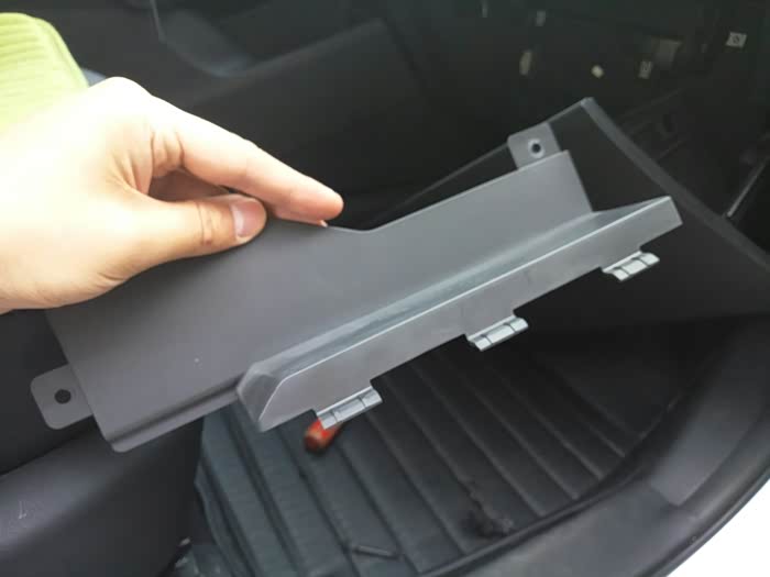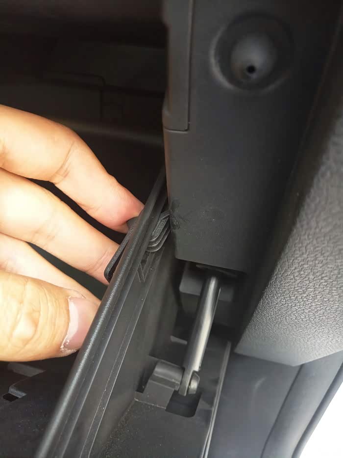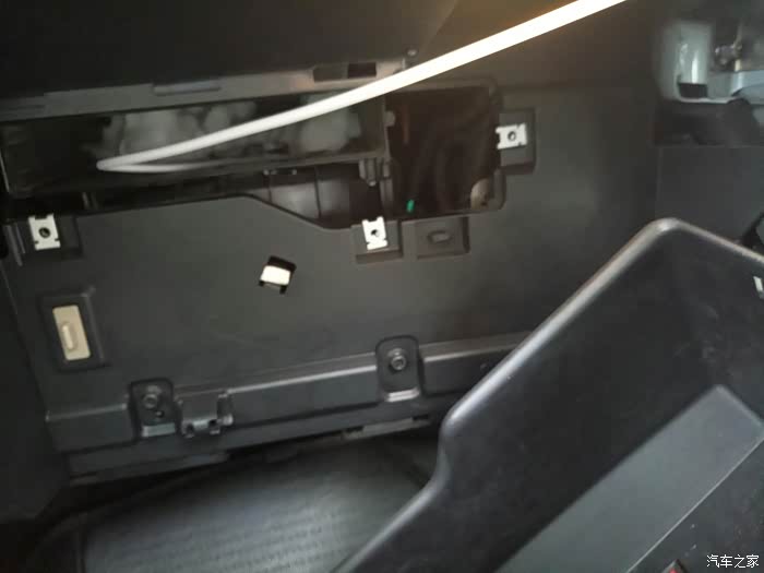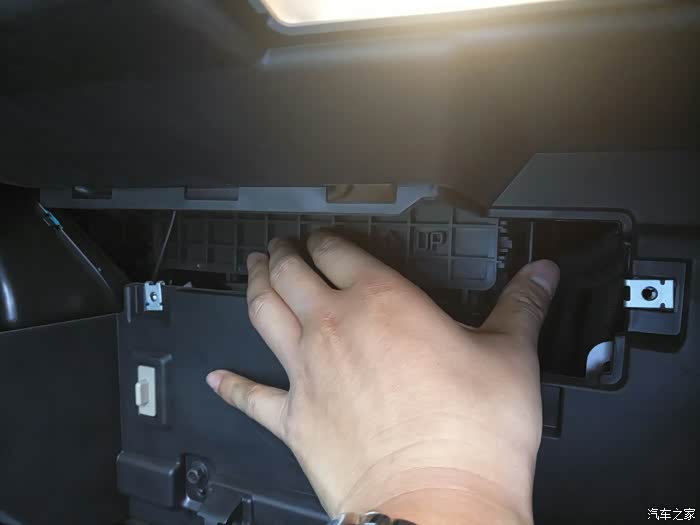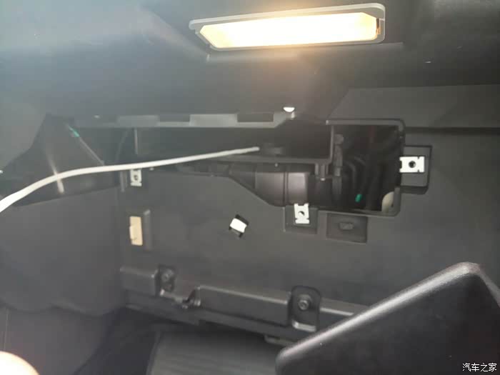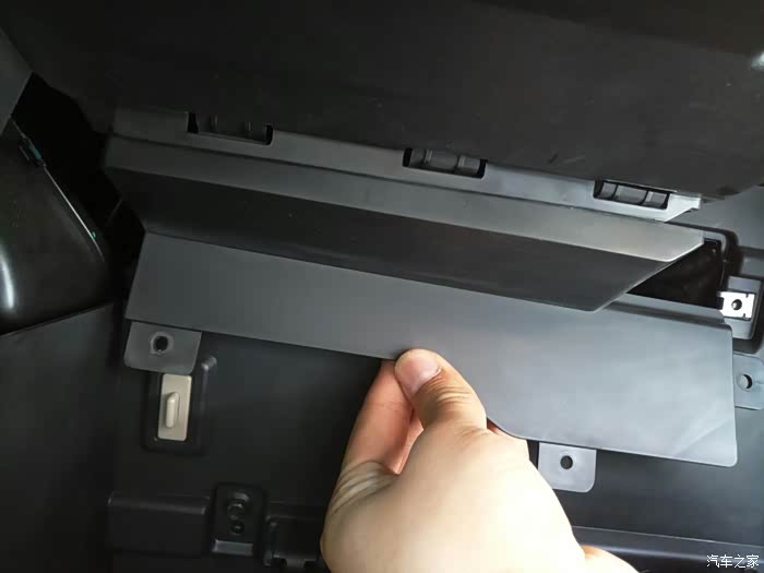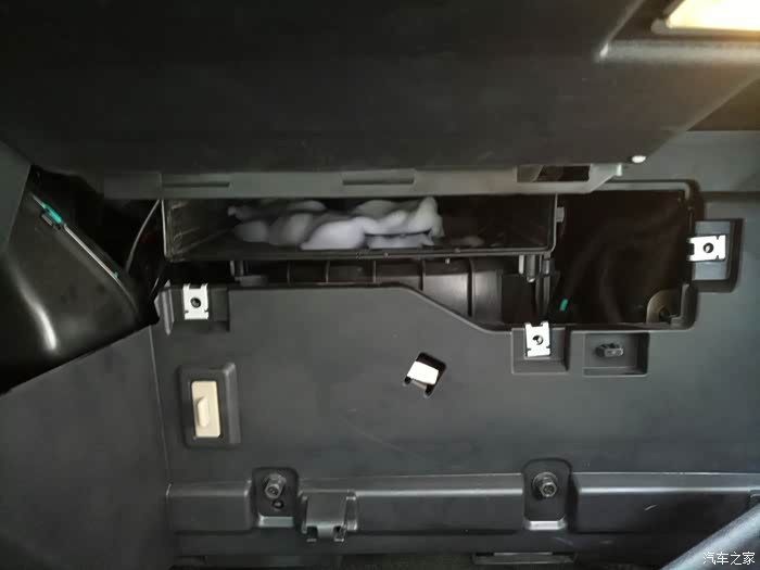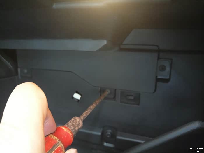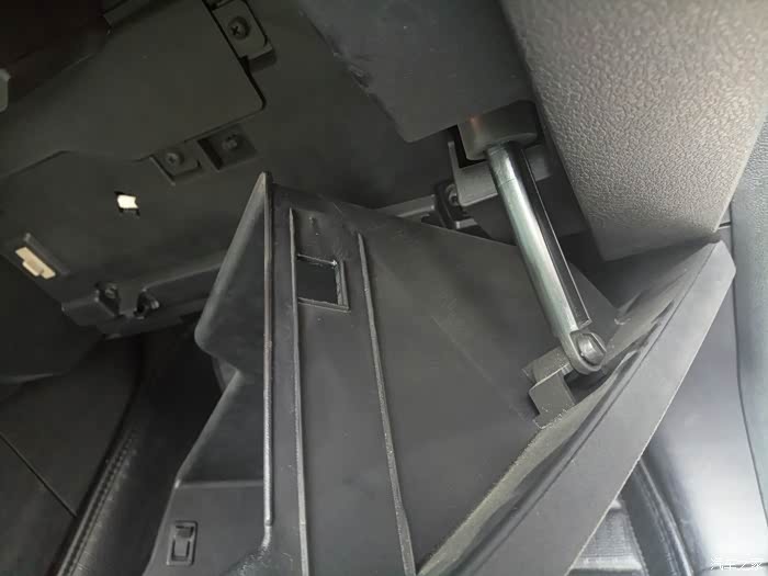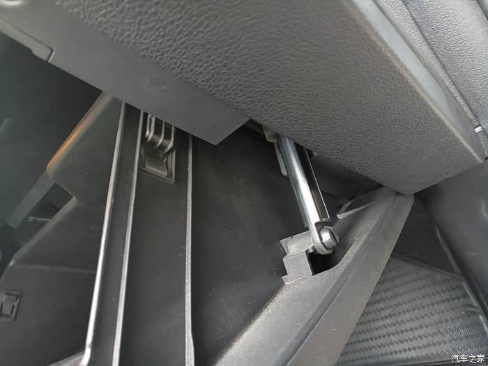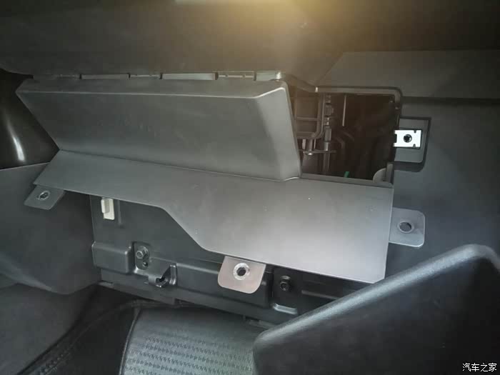 第一步,低头弯腰,眼睛看向手套箱底部,两根插销,拔出来就可以