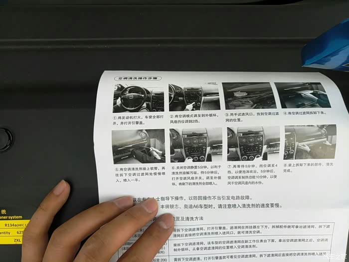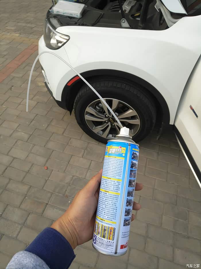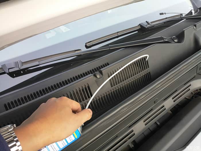 对准进气口开始喷喷喷,第一次进风口没找对位置,实际在副驾驶前挡的下方