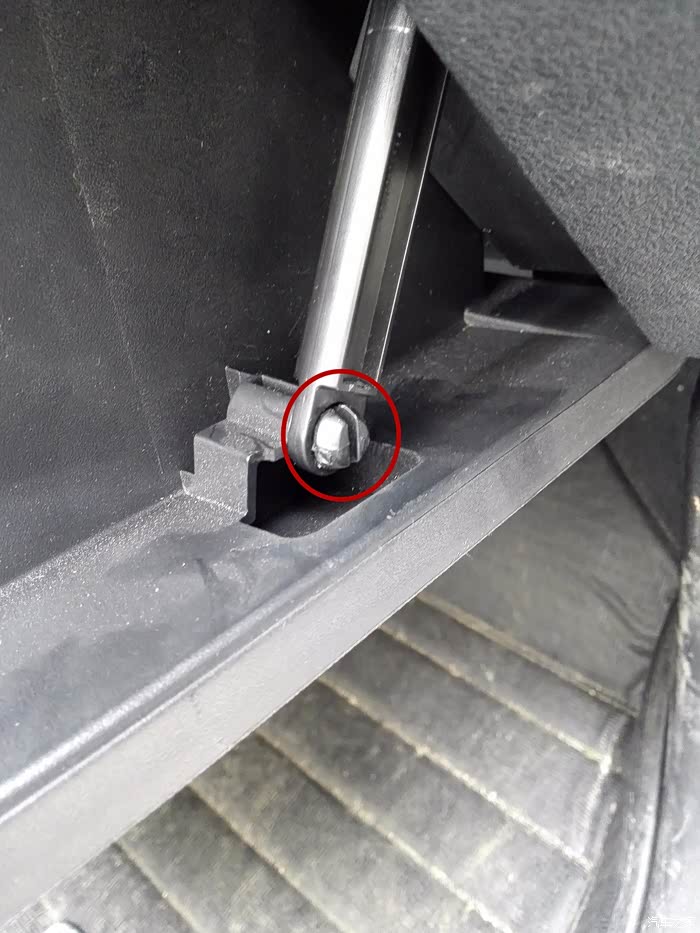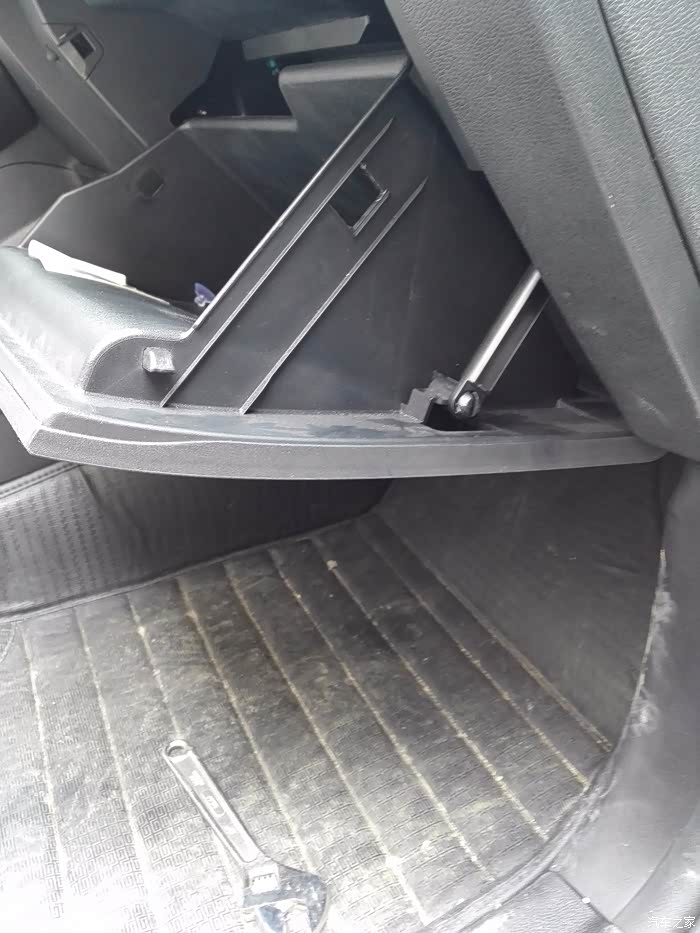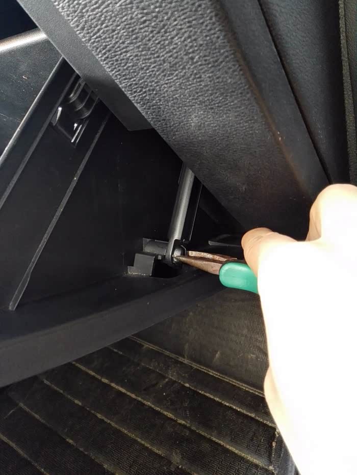 先清空手套箱里物品,看到手套箱边上的连接杆了吗?