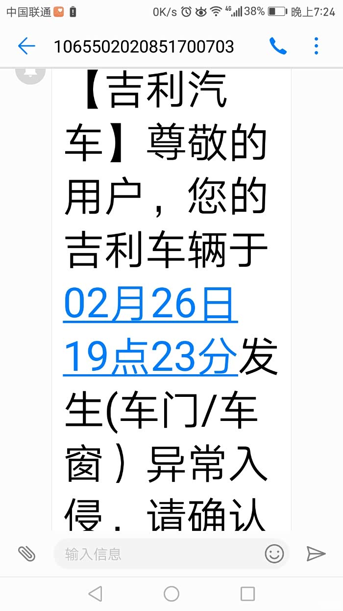 这是吉利总部发的手机信息。赞一个。不怕丢车了。