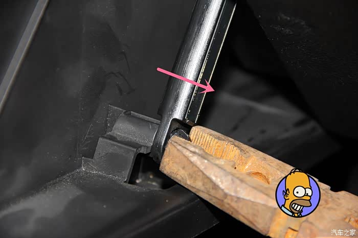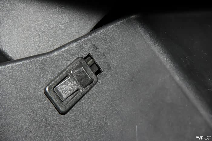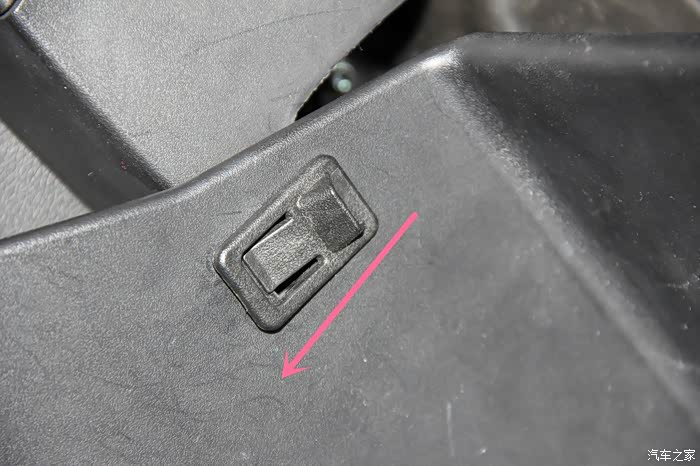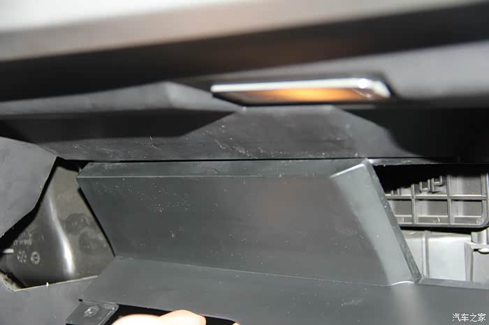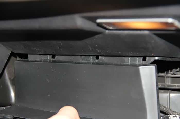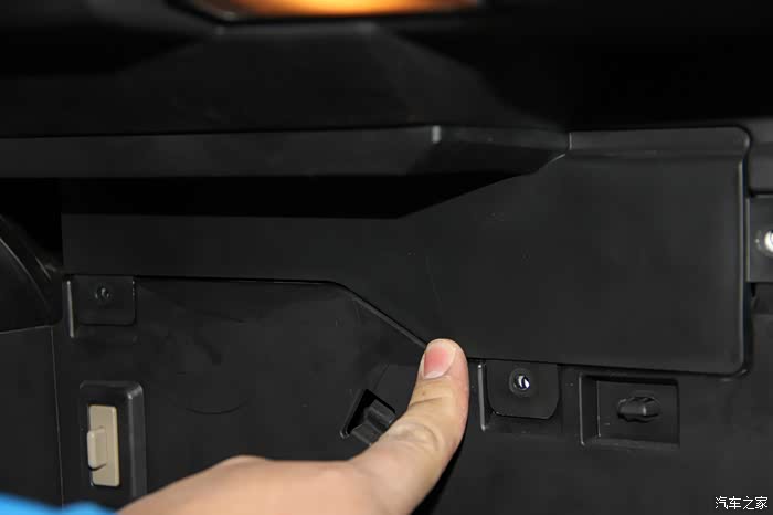 左边与右边卡扣有所不同,同样的,先将手套箱合上一点,然后按照箭头方向滑动