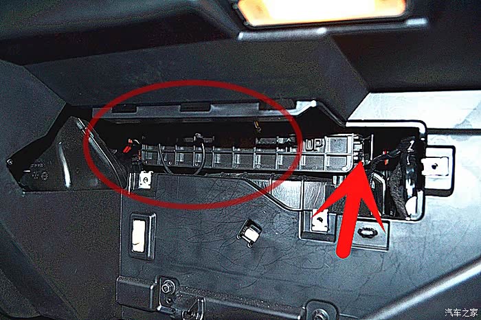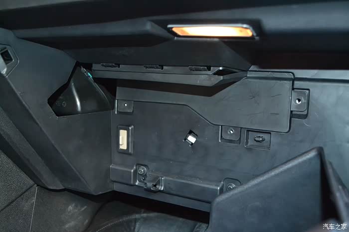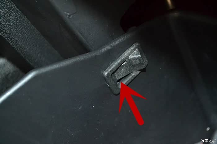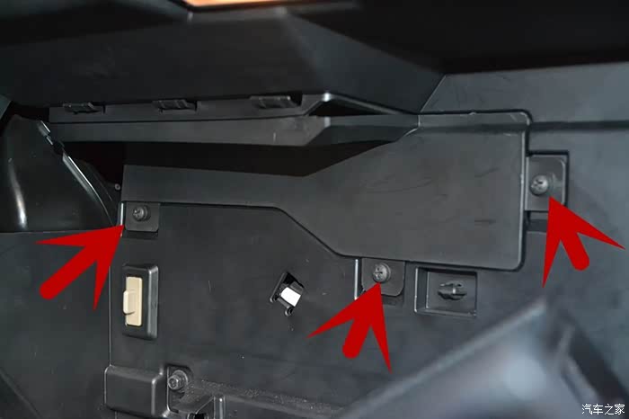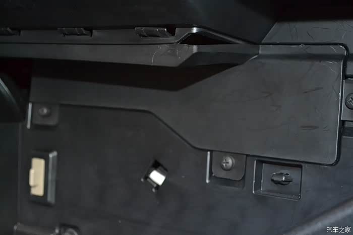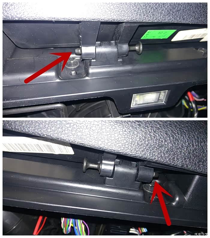拆手套箱一定要记住是把手套箱关闭的才可以拆下来。注意请看清楚,拆手套箱的关键就是在于这两个卡口螺栓。只要用手轻捏螺栓的头就可以把螺栓退出来了。