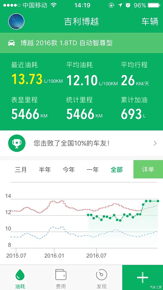 免费兑换的汽车之家车标。七、关于油耗,我要详细说一下,我基本全部在市区上下班开,通过油耗统计软件计算的平均油耗为12L/100km。暑假期间路况好一点,但是油耗也没下降多少也得11L/100km多一点,9月开学以后路上开始堵车了,油耗12L/100km多一点,最近一直加的95的汽油,3000做的首保,希望油耗还能下降一点10L/100km左右,但是路况不行啊,最近油耗已经上升到13个多了。
