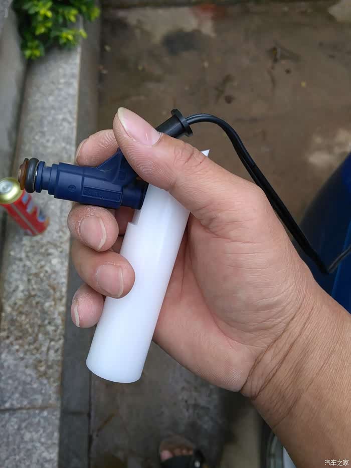 清洗工具通过电瓶取电,清洗过程要间断通电,喷油嘴喷出雾状就行