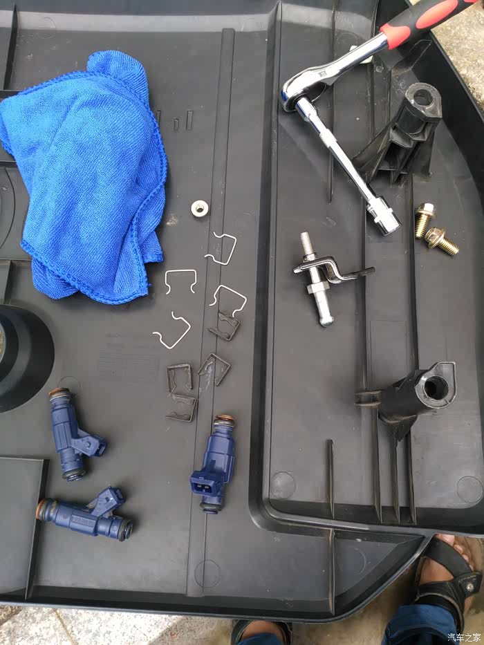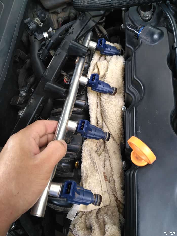 拔出喷油嘴,以免掉入发动机内,用毛巾盖住开孔,然后取出喷油嘴与上共轨管安装卡子,再单个拔出喷油嘴