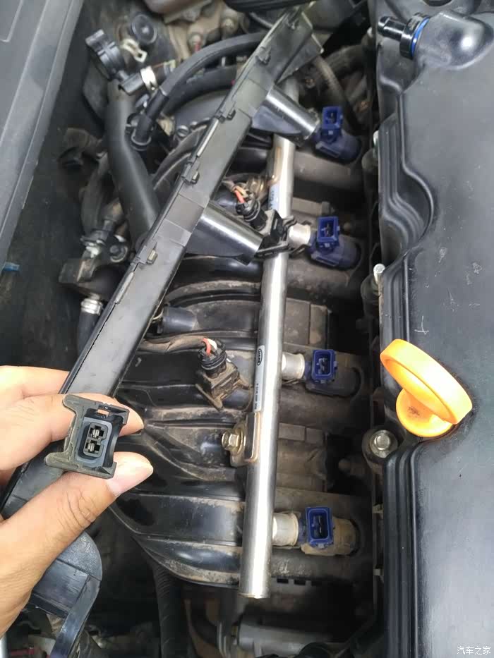 取下卡子,依次拔出插头,注间先清理喷油嘴附近的脏物,然后拆开喷油管上面两颗螺栓,两手试着抬油管朝安装反方向拔出。