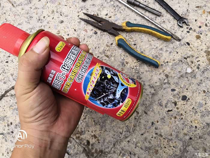 所需的清理材料:化油器清洗剂、毛巾、纸张、密封的手套(我没有带手套喷到手背辣辣的,稀释很强)