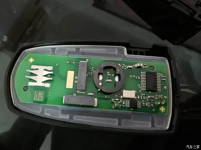 把钥匙壳打开之后,小心里面的芯片。把这个旧电池拿出来。拿出来之后看清楚正负极。
