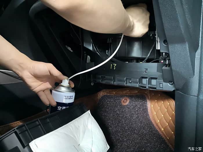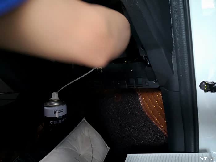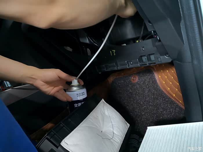 关上空调几分钟,等清洁剂泡沫溶解,再将剩余的半瓶全部喷入,再打开外循环,将风量打开到最大,吹几分钟