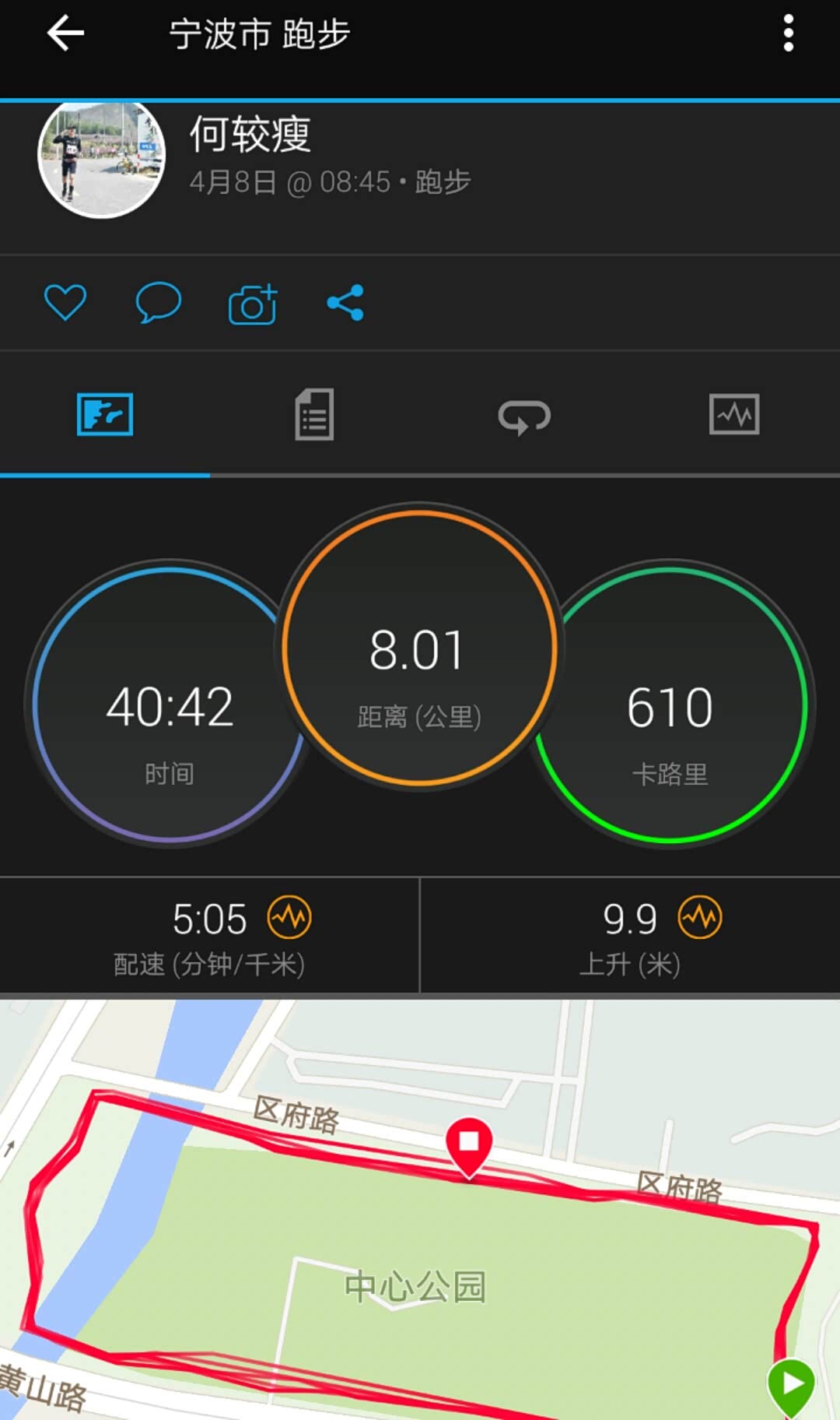 大汗淋漓,成功甩脂!腿很酸,心率也很高,但还能接受。这种配速跑很能锻炼心肺功能,对于我来说一周拉一次就够了,多了吃不消