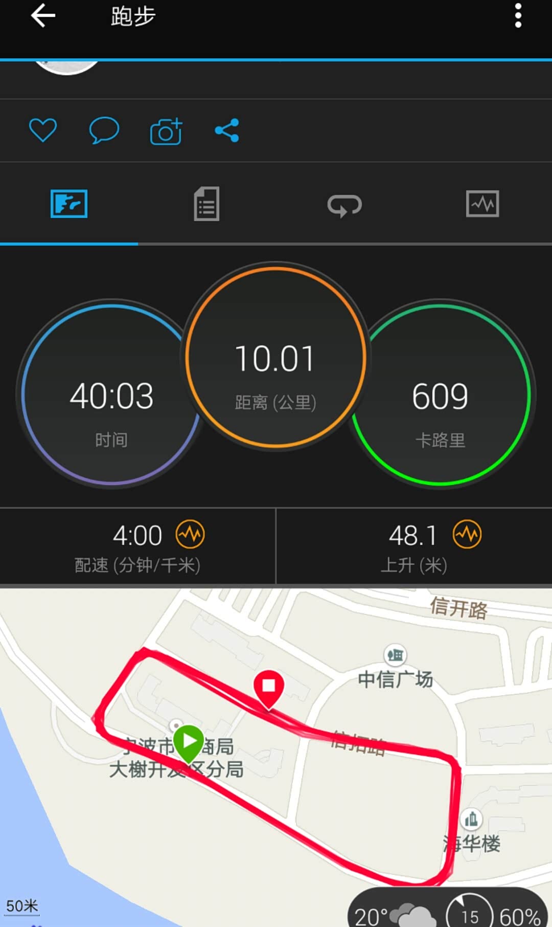 同样40分钟,比早上多跑2公里,配速的提高让人心狂跳不止,基本都是无氧跑了。
