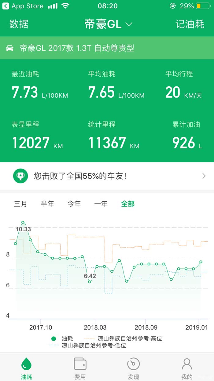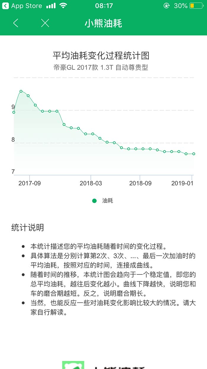 从买车到最近一次加油的油耗曲线,缓慢下降,最后稳在7个左右