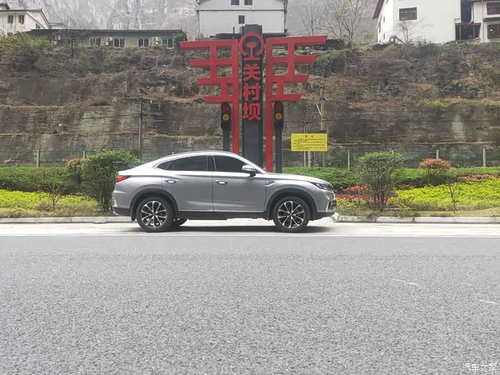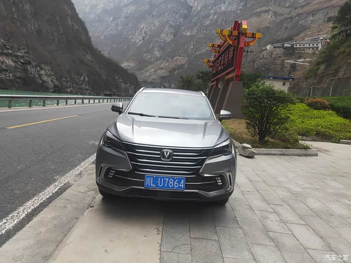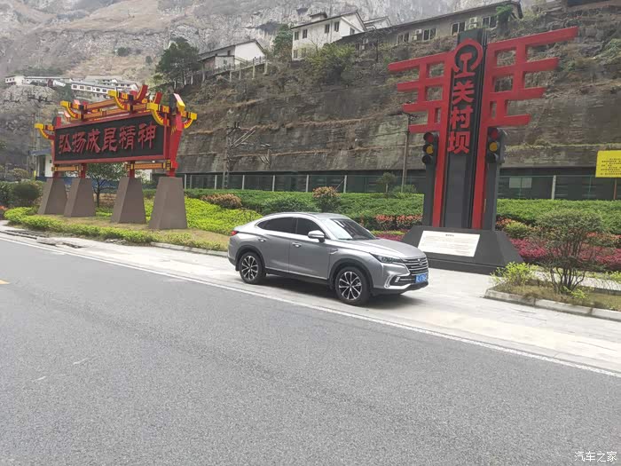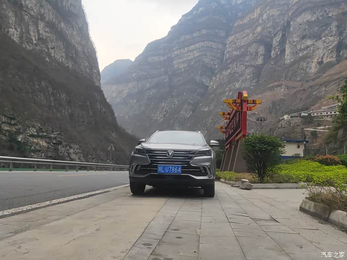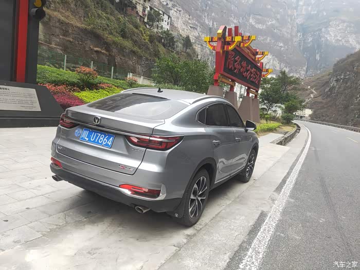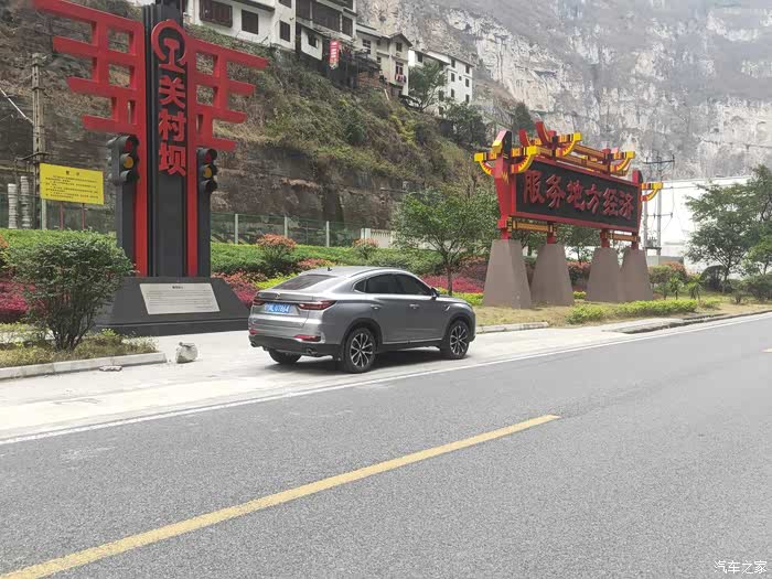 以上就是这一路上我记录下来的实际油耗。因为路上老是走走停停的,很多短的就没有给记录态势,实在是太多了,就把相对较长路程油耗记录下来。较长的路程看起来的油耗也更为准确一些。它的整体油耗表现是非常的好,特别是像这种自驾游,感觉他对于油耗整体的经济性非常的不错。上面的油耗记录能够很直观的反应出来。下面我们就一起来看看我的爱车长安cs85coupe在这最美峡谷中的峡谷第一村关村坝村口的自拍照。