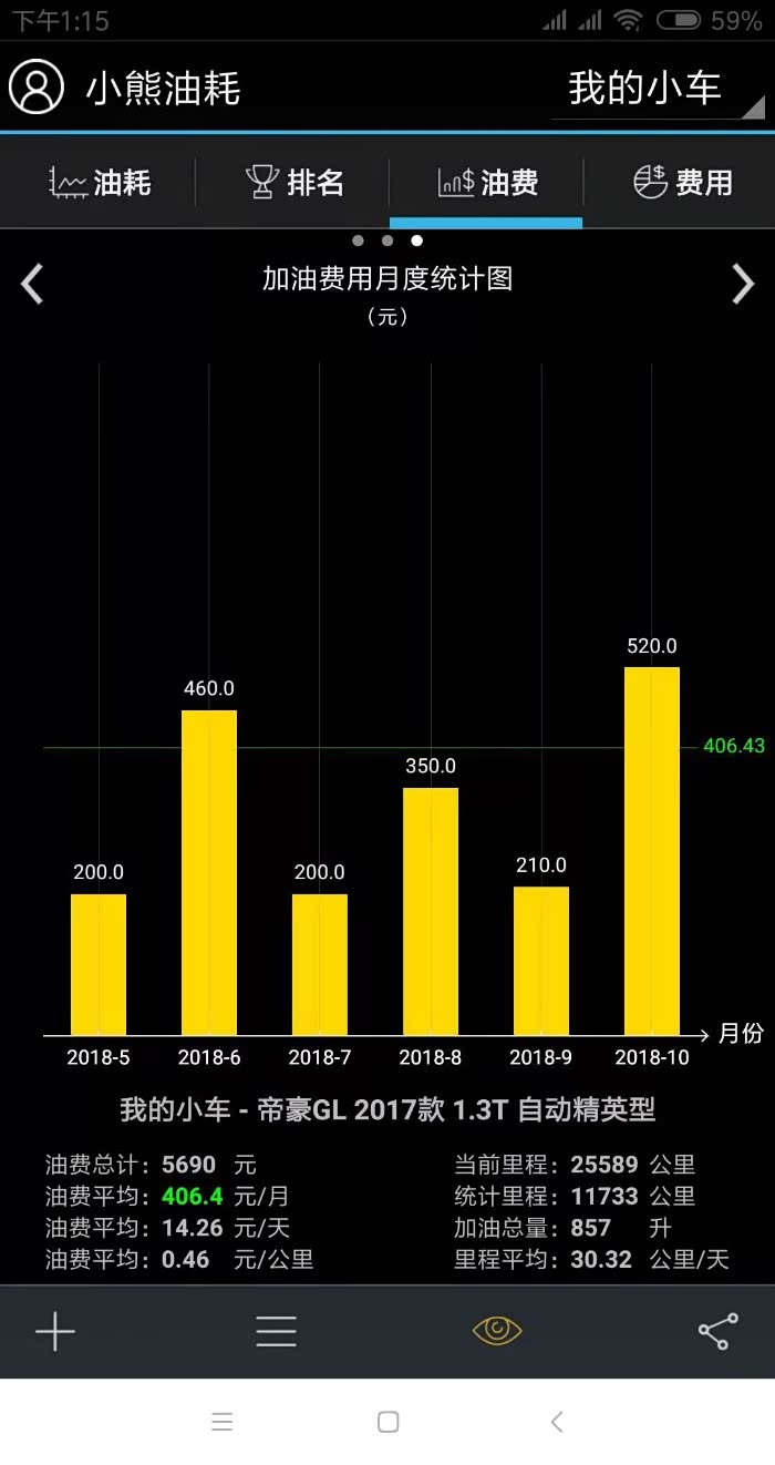 这是统计最近几个月的加油总费用,平均每公里花费0.46元。