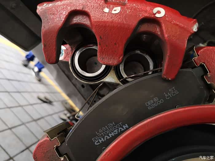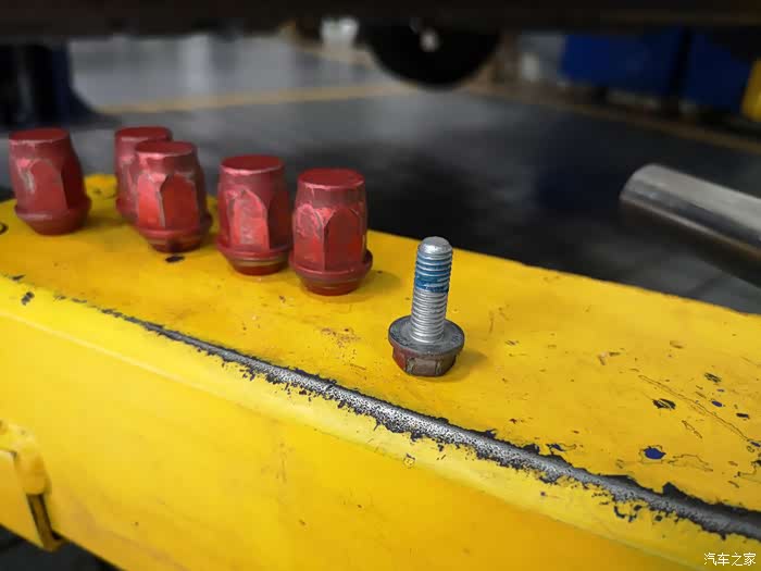 刹车卡钳螺丝,据师傅说,长安的做工和细节还是很不错的。看见螺丝上的那个蓝色了吗,师傅说这是一种防止螺丝松动的胶,很多车辆都没有这个看似细微的细节,但是长安有。