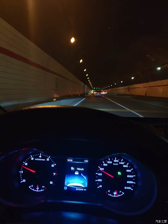 高速上ACC自适应巡航真是很省心。安全的保持跟车距离。定的70km,由于隧道里车多,车速会慢一些,自动降到55km左右。