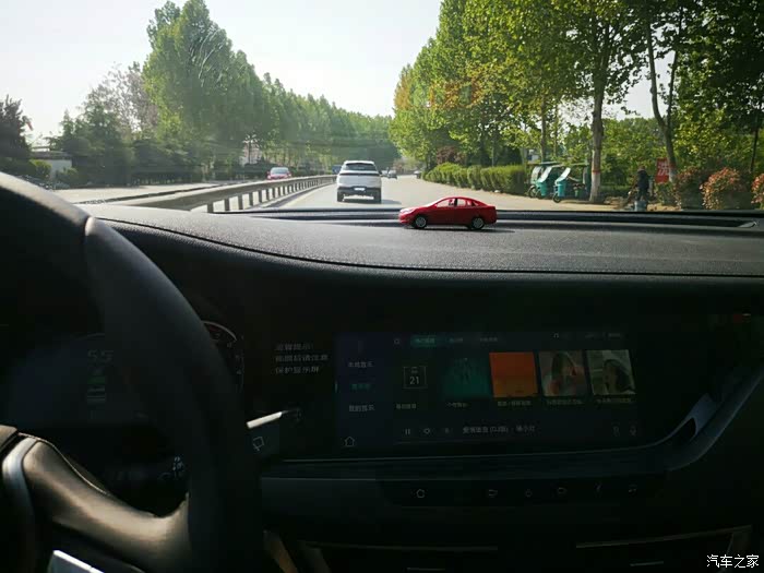 前面偶遇一辆55plus,打开ACC自适应巡航系统,一路跟随他前进。此时仪表盘上面显示红色的距离已经自动刹车。