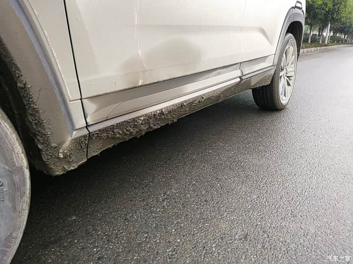 两边的车门上面泥巴都沾满了,我自己都快看不下去了😂。银色的门边条和白色的车门完全被泥巴灰覆盖。