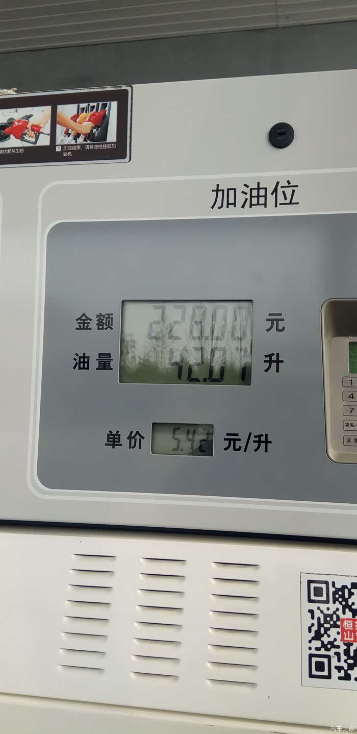 加满之后的数量,92的汽油,5.42元/升,加了42升,228元。