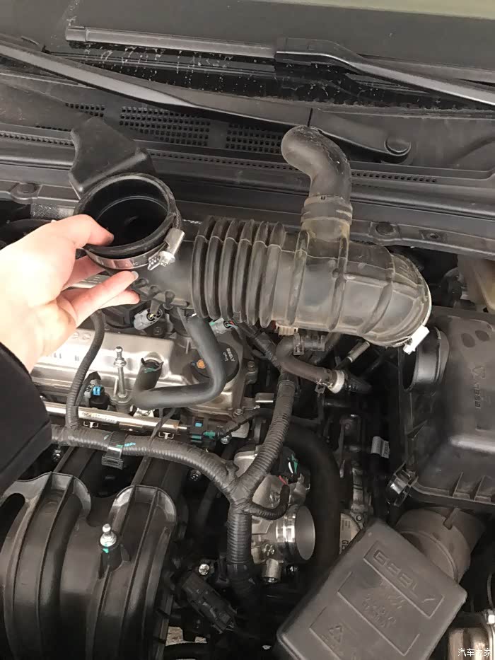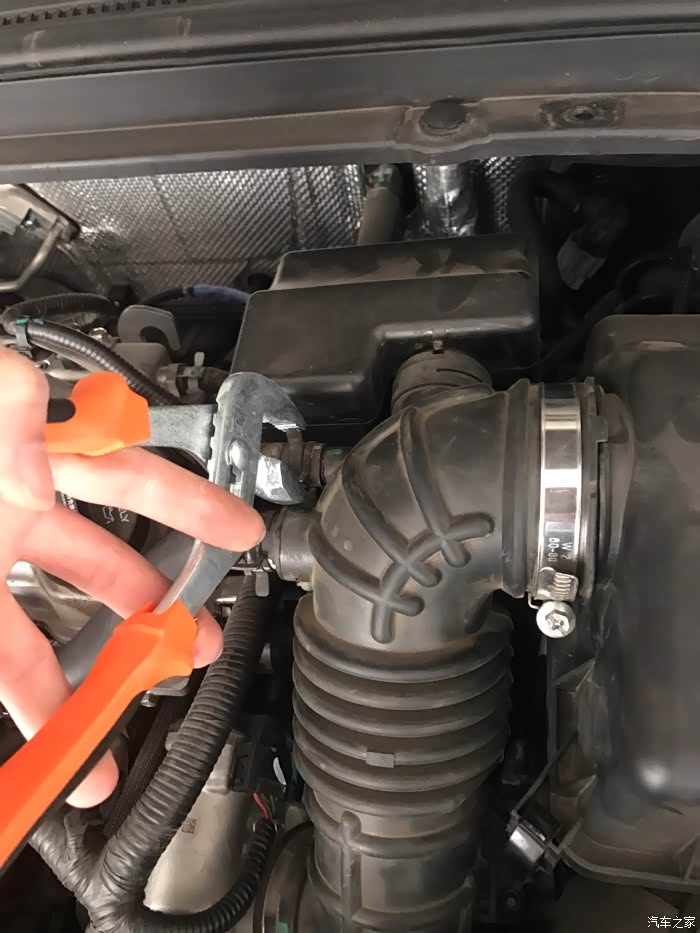 下面把进气管扳到不碍事儿的地方,不嫌麻烦的车友可以把进气管整个取下来,我是属于偷懒的车友,所以扳到一边了!