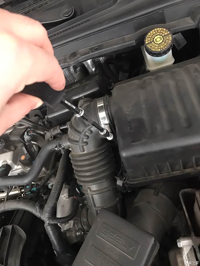 用8mm套筒或者十字花螺丝刀拆下进气管卡箍。(注意螺丝不用全拧下来,能把进气管顺利拿下来就行!
