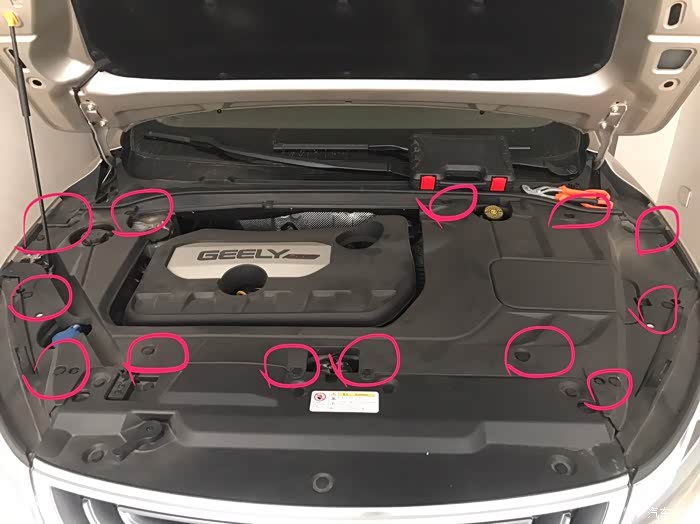 下面拆下发动机装饰罩的卡扣,一共13个卡扣!需要卡扣起子,为什么用起子,螺丝刀不行么?行,但是卡扣起子不容易损坏卡扣,所以用卡扣起子而不用螺丝刀!