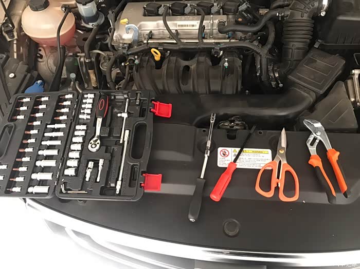 工具套盒(套筒和棘轮扳手)、卡扣起子、鱼嘴钳、剪刀?等等,清洗节气门需要剪刀吗?稍后给大家公布剪刀的作用